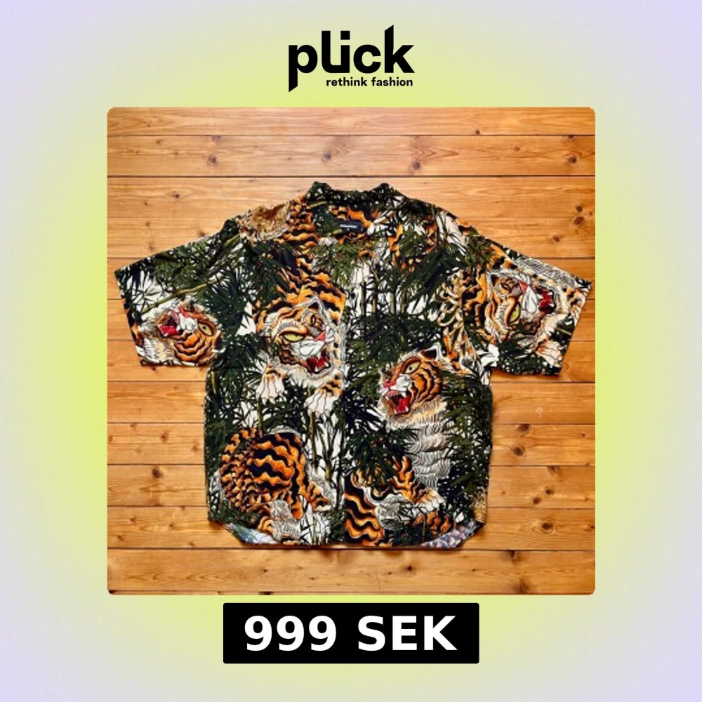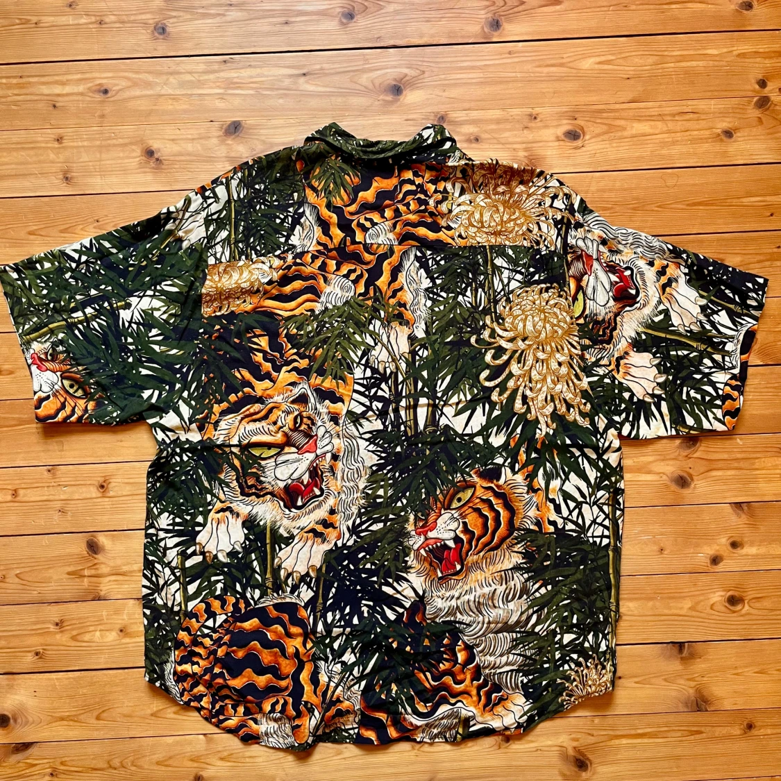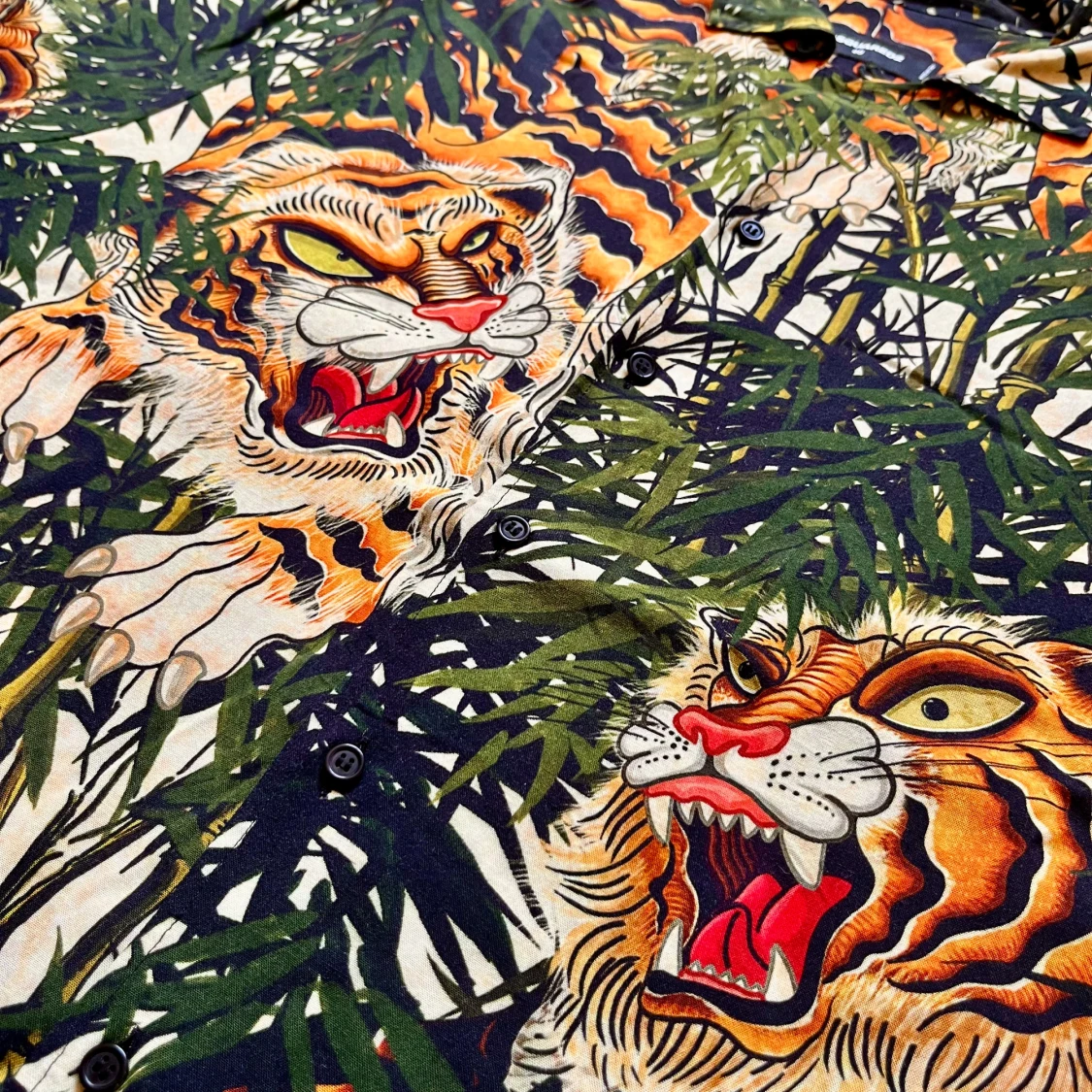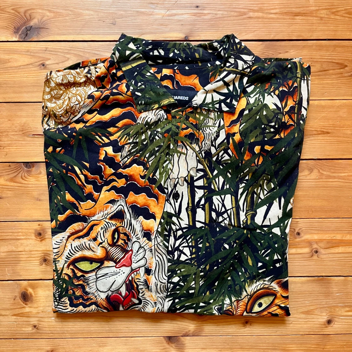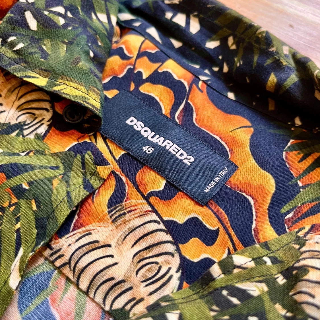 Skjorta från DSQUARED2 med tigerprint i orange, svart, grön och beige. Korta ärmar, knappar framtill och tillverkad i tunn bomull. med djungelvibbar. Nypris 4000kr