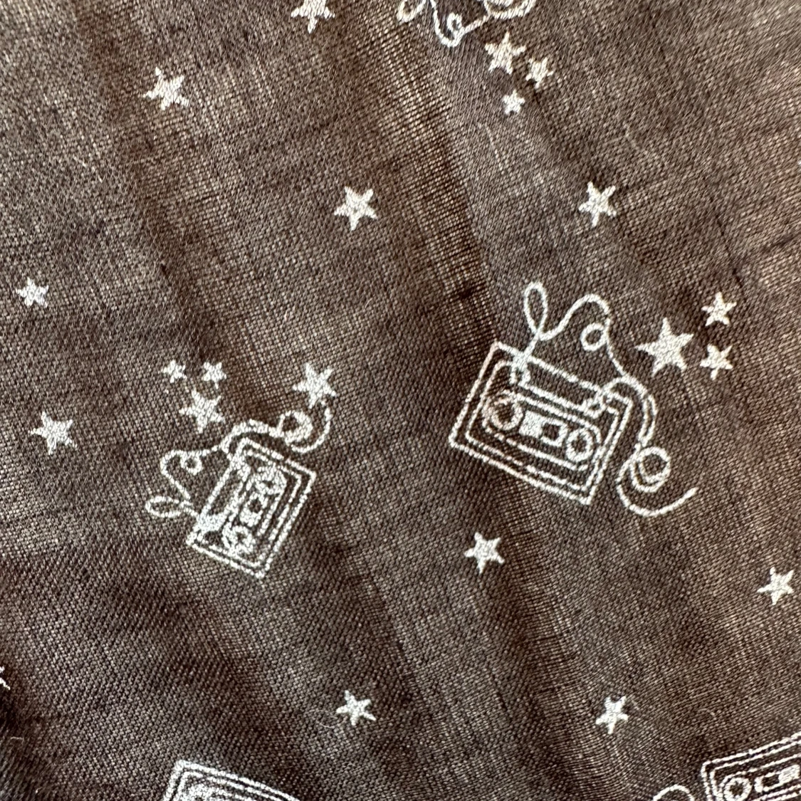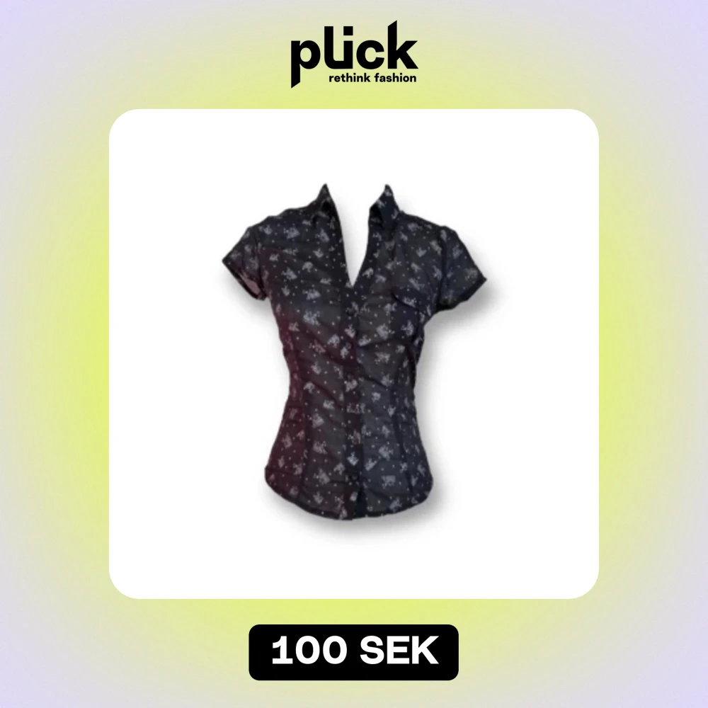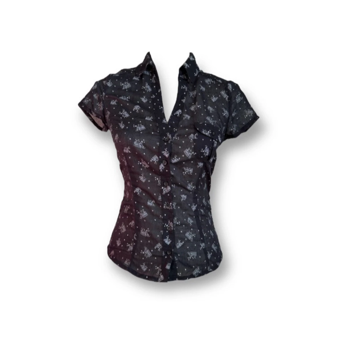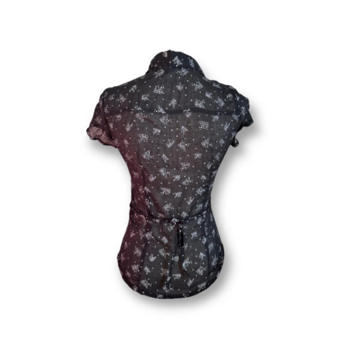 En svart skjorta med ett mönster med kassettband i vitt. Skjortan har korta ärmar och knappar framtill samt ett band i midjan för bättre passform. Fint skick!