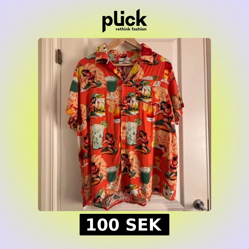 Säljer en färgglad kortärmad skjorta från Indigo med ett livligt mönster av drinkar och figurer. Skjortan har en avslappnad passform och knappar framtill. Perfekt för en somrig look! 🍹