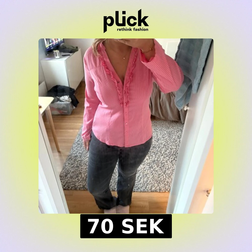 Supersöt rosa skjorta/blus från Orsay med tunna vita ränder och volangdetaljer längs v-ringningen. Långärmad modell med knappar framtill och lätt figurnära passform. Skriv vid frågor🩷