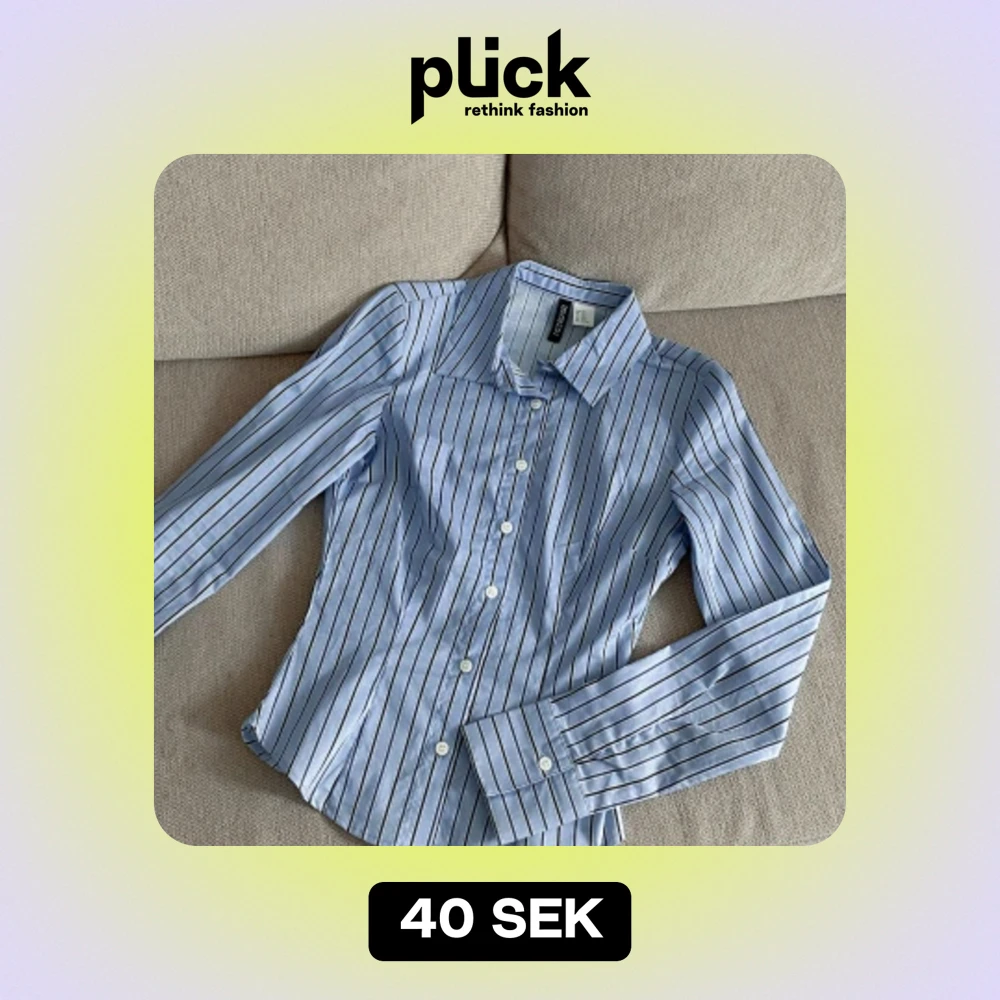 Figursydd skjorta - Blåvit randig figursydd skjorta ifrån Hm. Storlek 38. Finns ett litet blått streck på framsidan men kanske kan gå bort i tvätten. Använd 1 gång så annars mycket fint skick! 💞