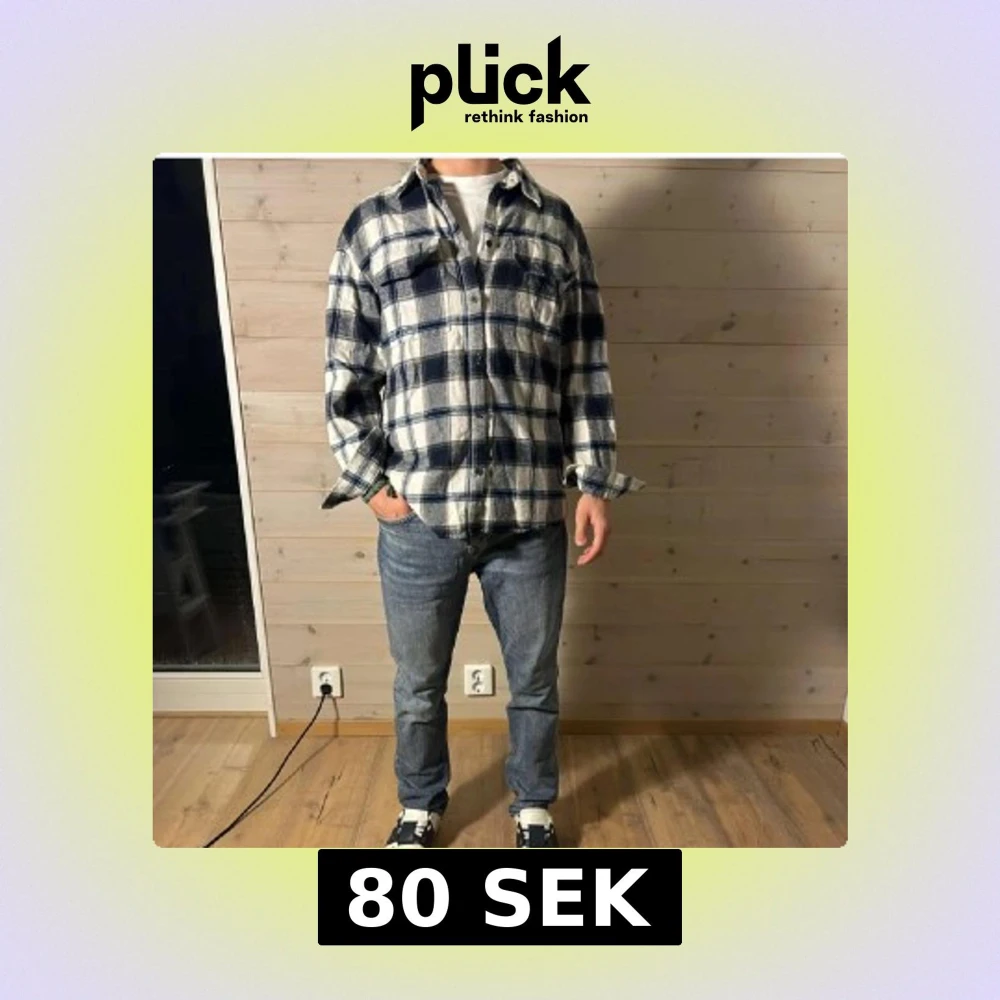 Säljer en blåvit rutig overshirt med långa ärmar och klassisk krage. Skjortan har knappar framtill och en bröstficka. Perfekt att slänga över en t-shirt för en avslappnad look.