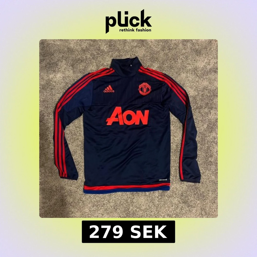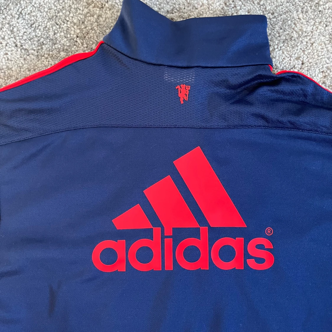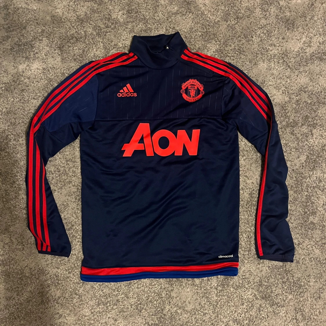 Mörkblå Manchester United träningströja från Adidas med röda detaljer och loggor. Långärmad modell i funktionsmaterial (climacool) med hög krage, röda ränder längs ärmarna och stor AON-logga på bröstet. Perfekt för dig som älskar fotboll och vill visa att man är en riktig fan!