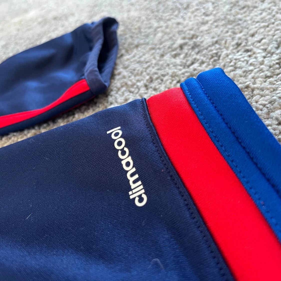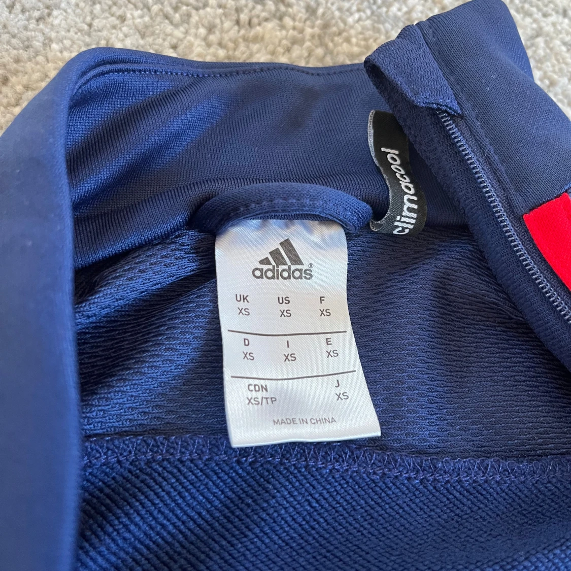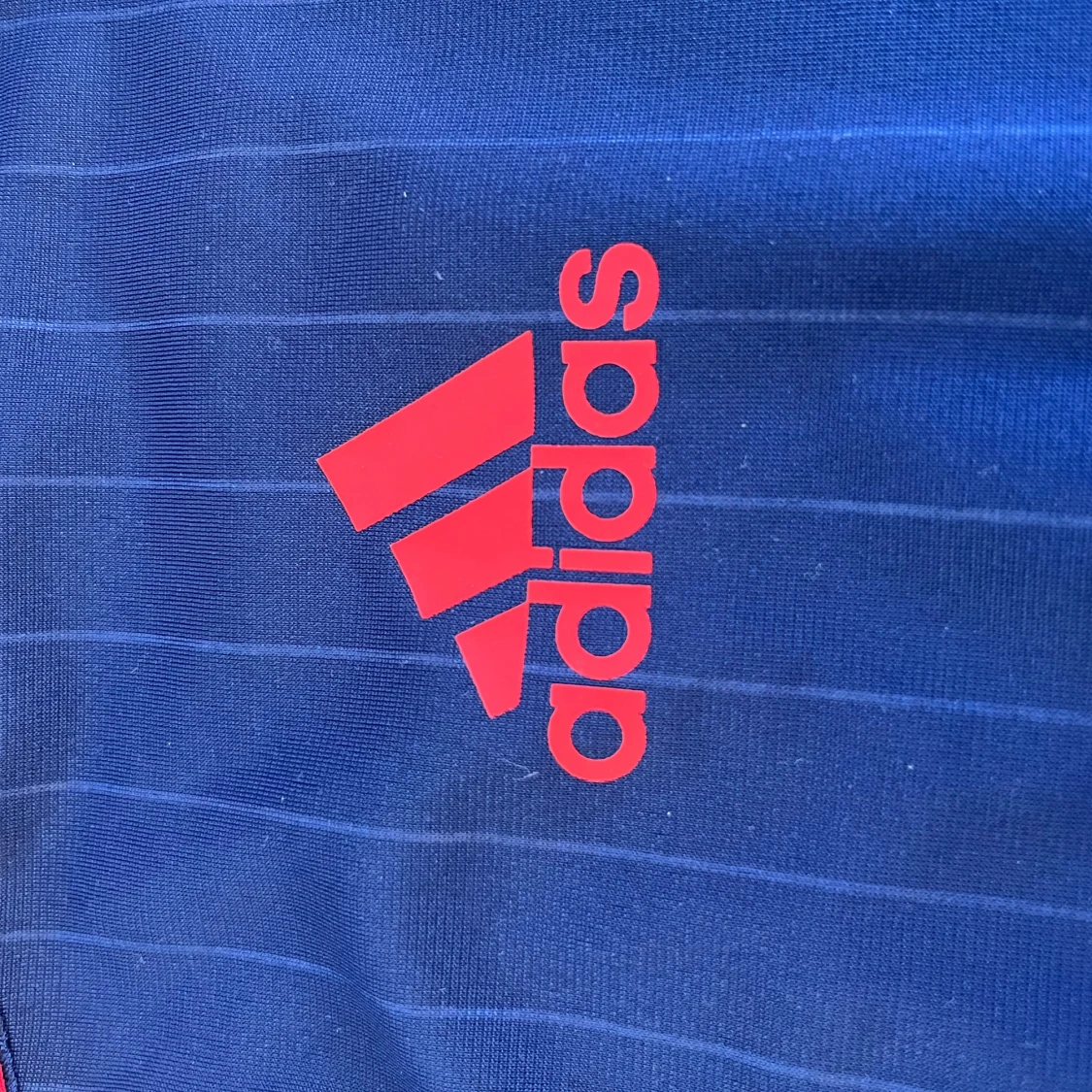 Mörkblå Manchester United träningströja från Adidas med röda detaljer och loggor. Långärmad modell i funktionsmaterial (climacool) med hög krage, röda ränder längs ärmarna och stor AON-logga på bröstet. Perfekt för dig som älskar fotboll och vill visa att man är en riktig fan!