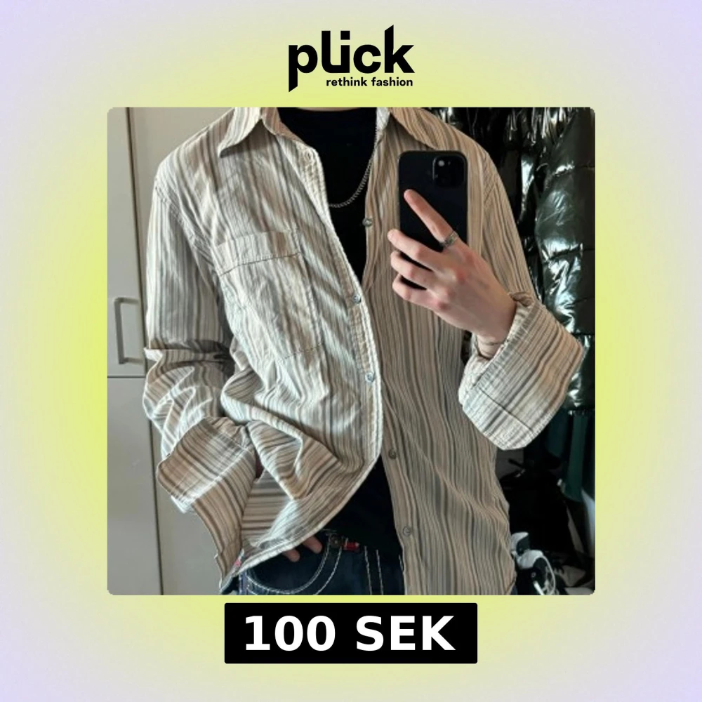 En randig skjorta med långa ärmar. Skjortan har en ficka på bröstet och knappar framtill. I fint skick förutom en liten defekt på höger arm, se bild. Mått: Axelbredd 46 cm Längd 75 cm Bröstkorg 55 cm Hemm 53 cm