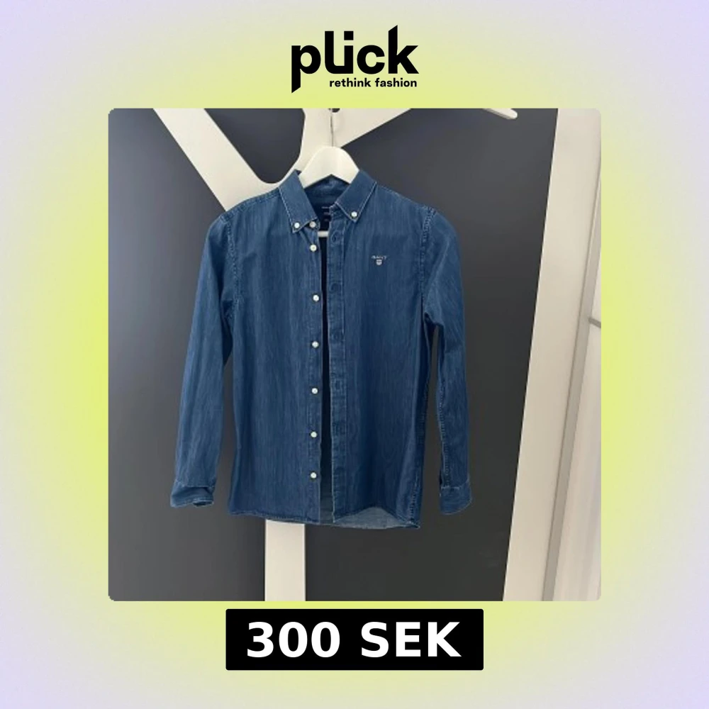 Säljer en klassisk blå jeansskjorta från Gant med vita knappar och broderad logga på bröstet. Skjortan har lång ärm och button-down krage, perfekt för en avslappnad men snygg stil.