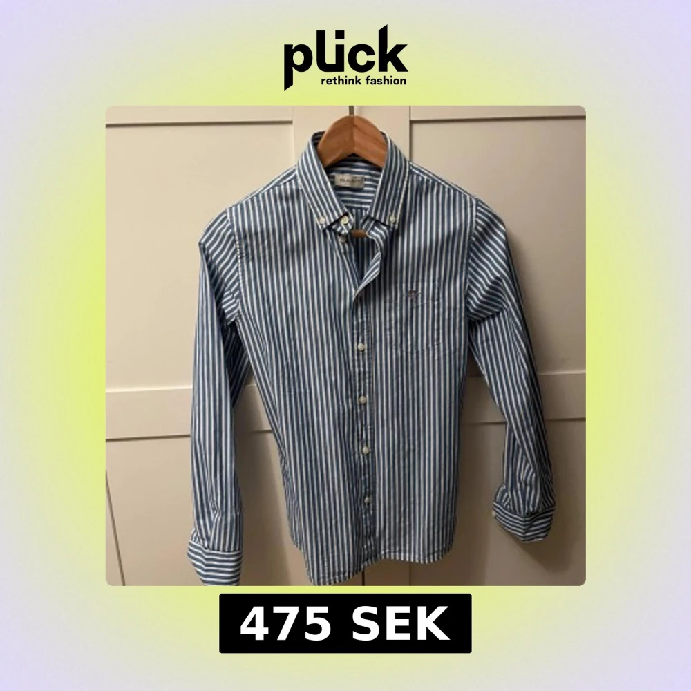 Snygg blå och vit randig skjorta från Gant med klassisk button down-krage och bröstficka med broderad logga. Skjortan har långa ärmar och stängs med vita knappar framtill. Använd en gång. Pris kan förhandlas