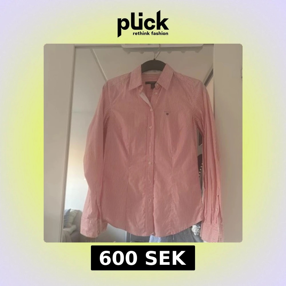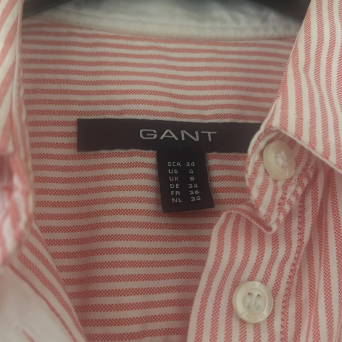 Säljer en klassisk rosa och vit randig skjorta från GANT i storlek 34. Skjortan har lång ärm, knappar framtill och liten broderad logga på bröstet. Tillverkad i 100% bomull för en skön och luftig känsla.