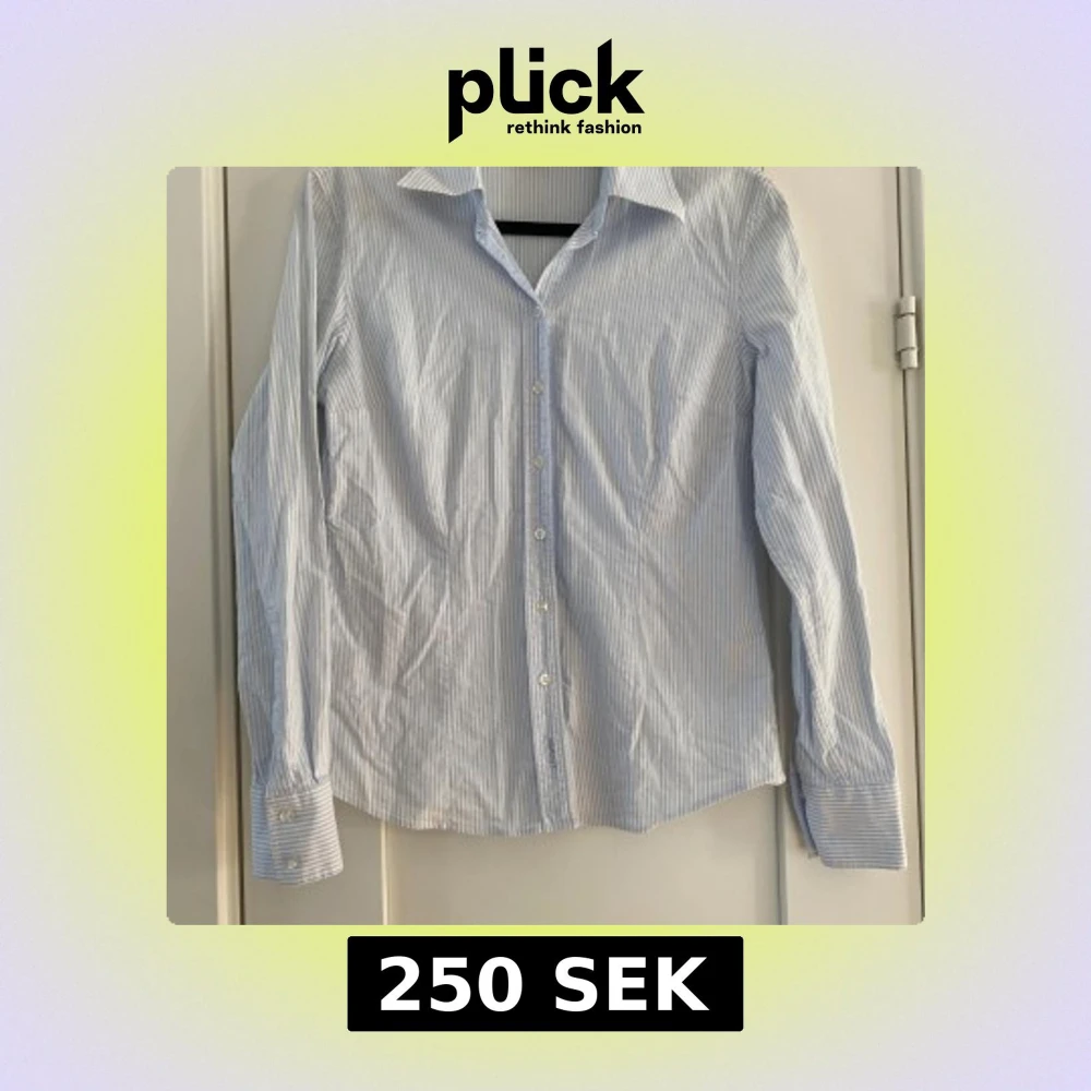 Säljer en stilren blåvit randig skjorta från GANT. Skjortan har långa ärmar och knappar framtill. Perfekt för en klassisk look. Blå och vit randig skjorta i strl 38 från Gant. Använd men i fint begagnat skick förutom att skjortan är lite lätt missfärgad på kragen i nacken. Mått Över bröstet: ca 48 cm Längd från axeln och ner: ca 64 cm 97% bomull och 3% elastan Kommer från ett djur och rökfritt hem.