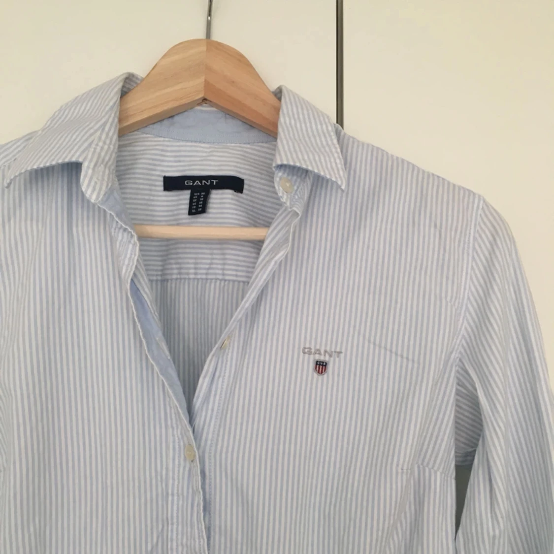 Snygg randig skjorta i ljusblå och vit från Gant. Fint skick, den är knappt använd. Nypris 1000 kr!