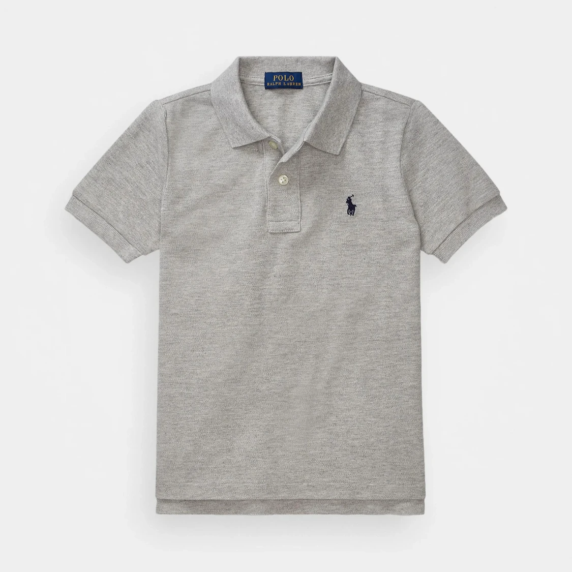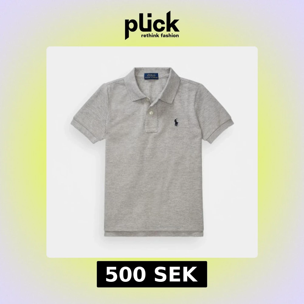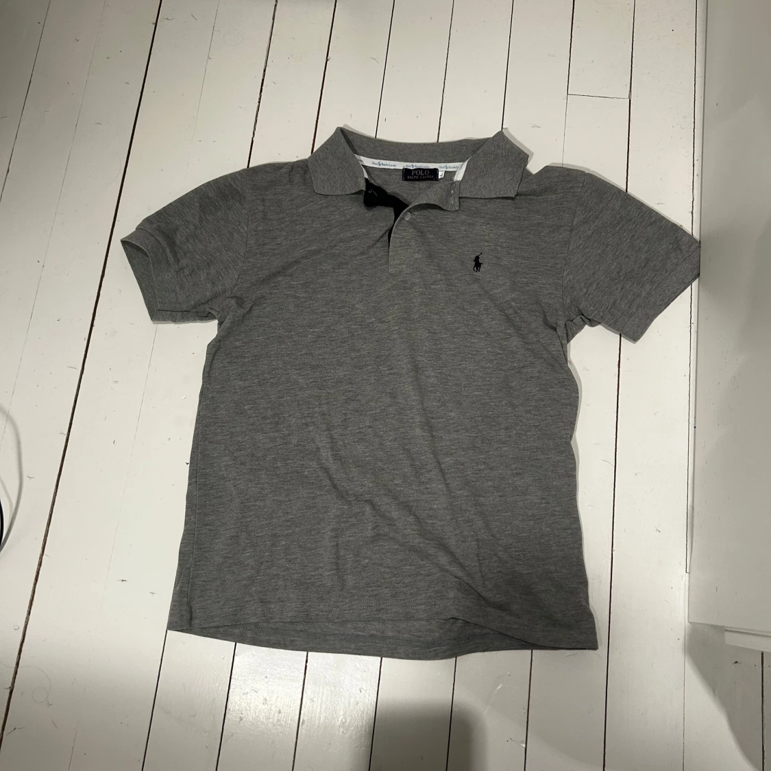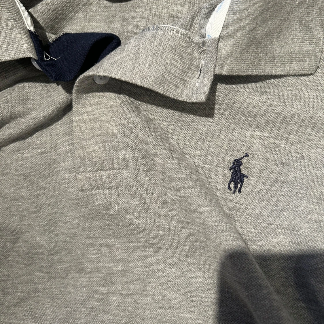 Klassisk grå pikétröja från Polo Ralph Lauren med korta ärmar och broderad marinblå logga på bröstet. Tröjan har krage, två knappar och är gjord i mjuk bomull. Perfekt för en clean och stilren look. Har aldrig använt den då den är för stor för mig