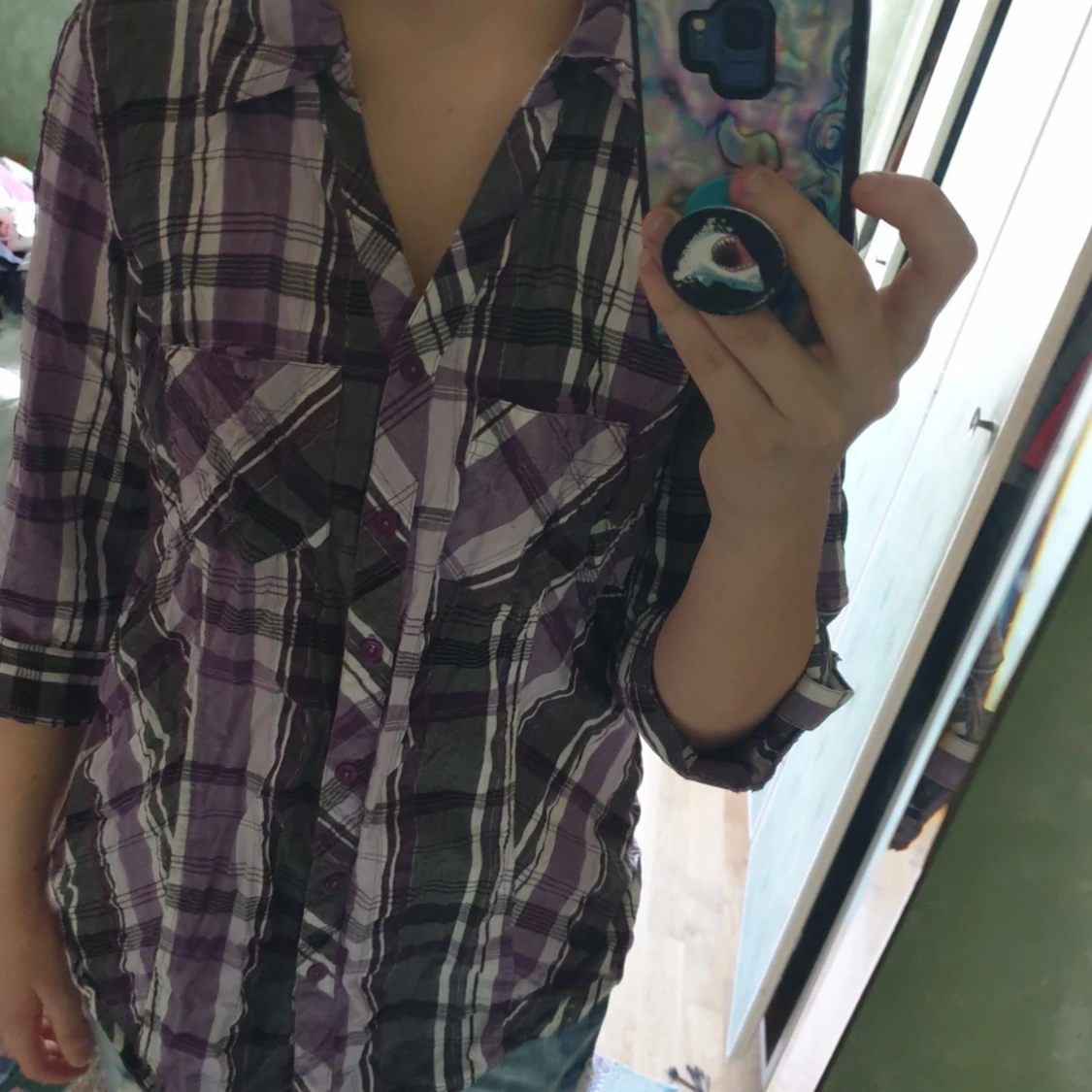Lila skjorta, designad utan översta knapparna och insydd i kanterna. Frakt inte inkluderad.