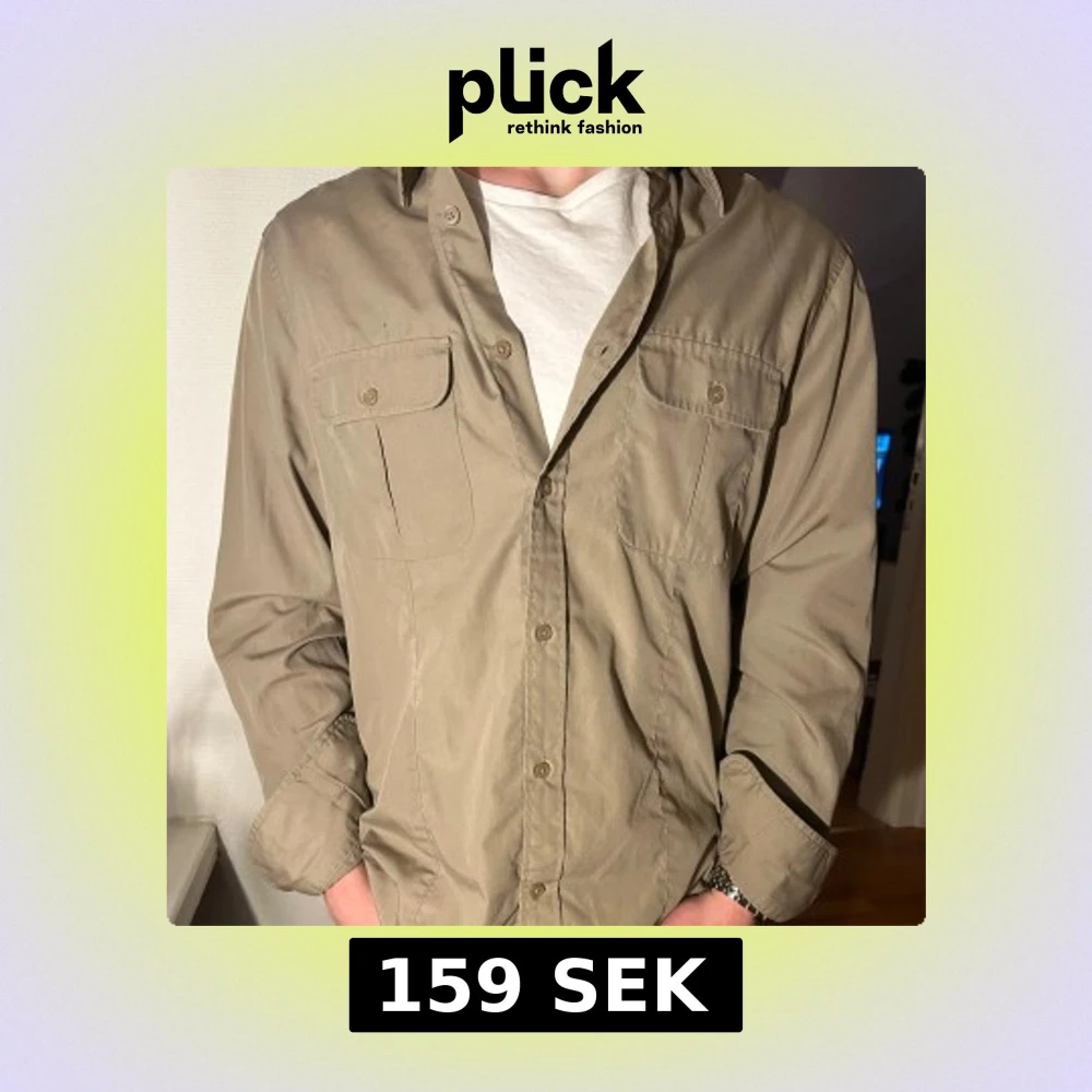 Snygg beige overshirt från H&M med långa ärmar och klassisk krage. Overshirten har två bröstfickor med knappar och axelklaffar för en coolare look. Perfekt för en avslappnad men ändå uppklädd stil.