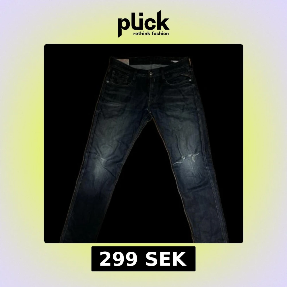 Snygga mörkblå jeans från Replay med slitna detaljer på framsidan. Klassisk femficksdesign och knappgylf. Perfekta för en avslappnad stil. De har både fabriks slitningar och några schyssta slitningar som har skett vid användning. Det är storleken 32/34 vilket även finns bild på i annonsen. Skicka gärna prisförslag och kom med frågor vid undringar!😃