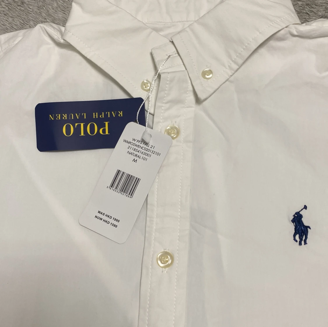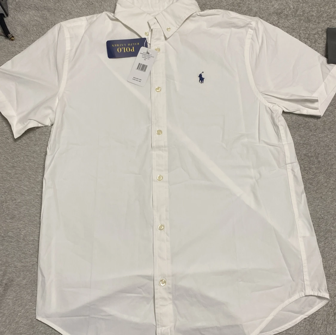 Klassisk vit skjorta från Polo Ralph Lauren med korta ärmar och button-down krage. Skjortan har broderad blå logga på bröstet och stängs med vita knappar framtill. Tillverkad i mjuk bomull, perfekt för en clean och stilren look.