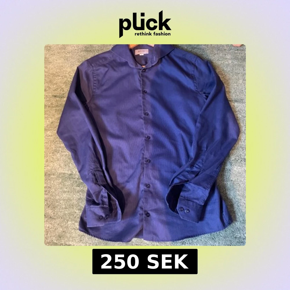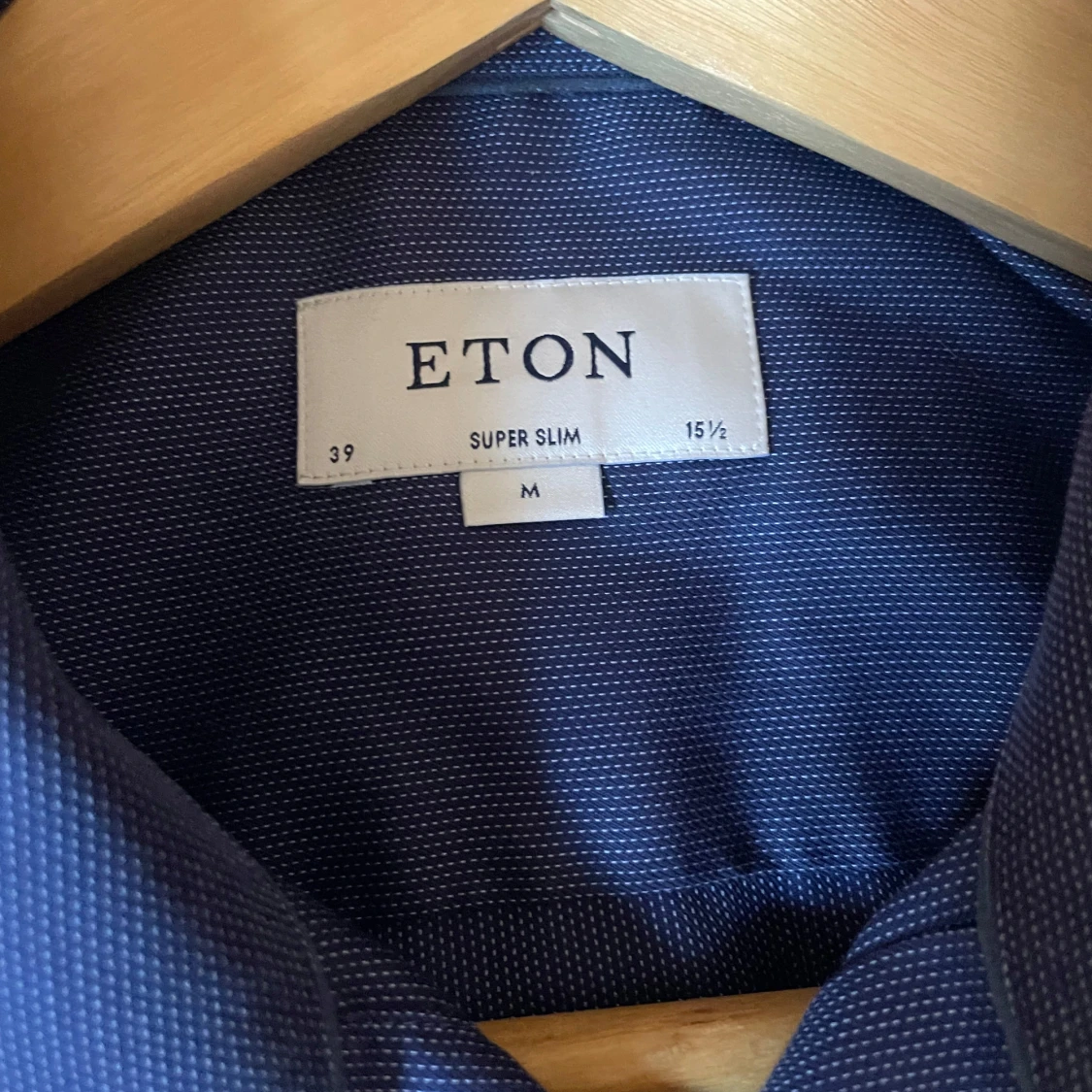 Snygg mörkblå skjorta från Eton i super slim passform. Skjortan har diskret prickigt mönster, klassisk krage och långa ärmar med dubbla knappar vid manschetten. Perfekt för dig som gillar stilrena och tajta skjortor.