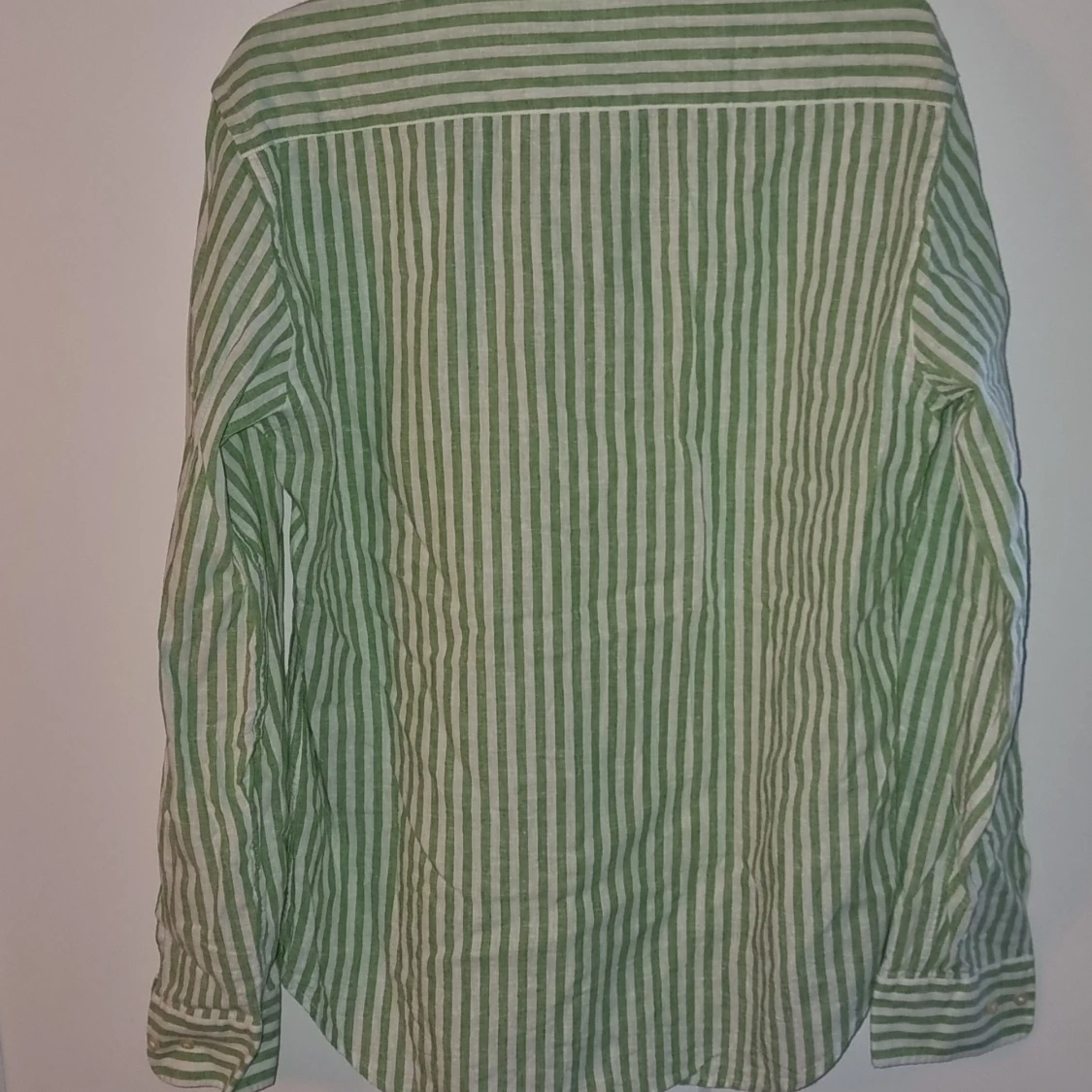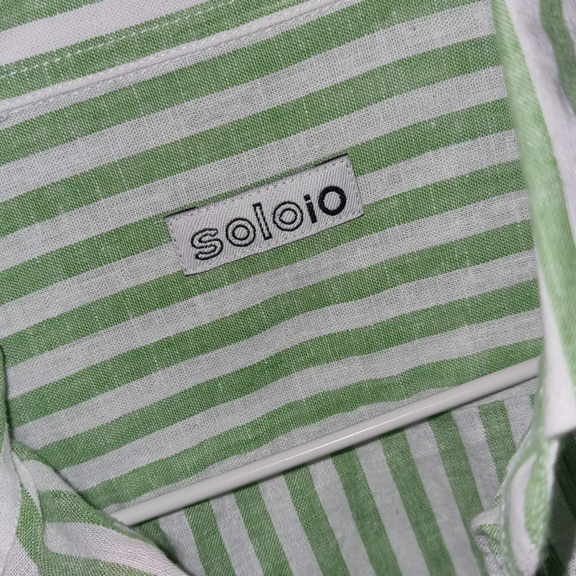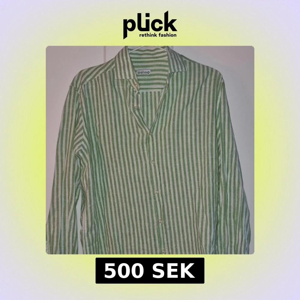 Snygg grön- och vitrandig skjorta från Soloio med klassisk krage och knappar framtill. Skjortan har långa ärmar och är perfekt för en stilren look, både knäppt som uppknäppt. Storlek xs men skulle säga att den är oversized, passar både män o kvinnor:) nypris runt 2500