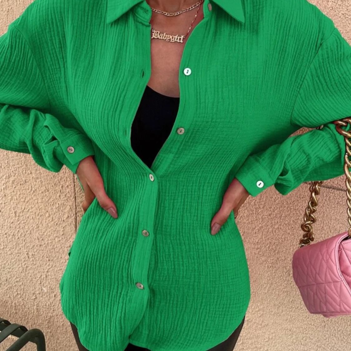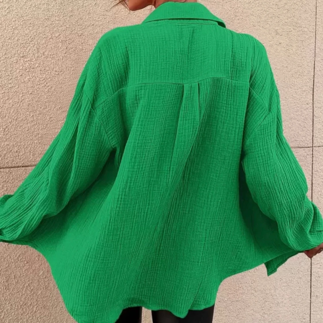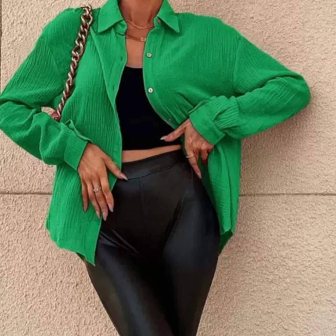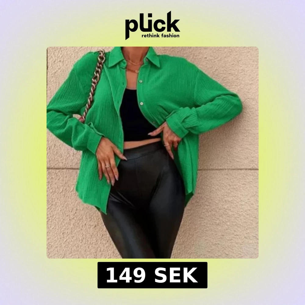 Snygg grön skjorta i oversized modell med klassisk krage och knäppning framtill. Skjortan är tillverkad i ett mjukt, strukturerat bomullstyg och har långa ärmar med manschett. Perfekt att styla lager på lager för en trendig look.