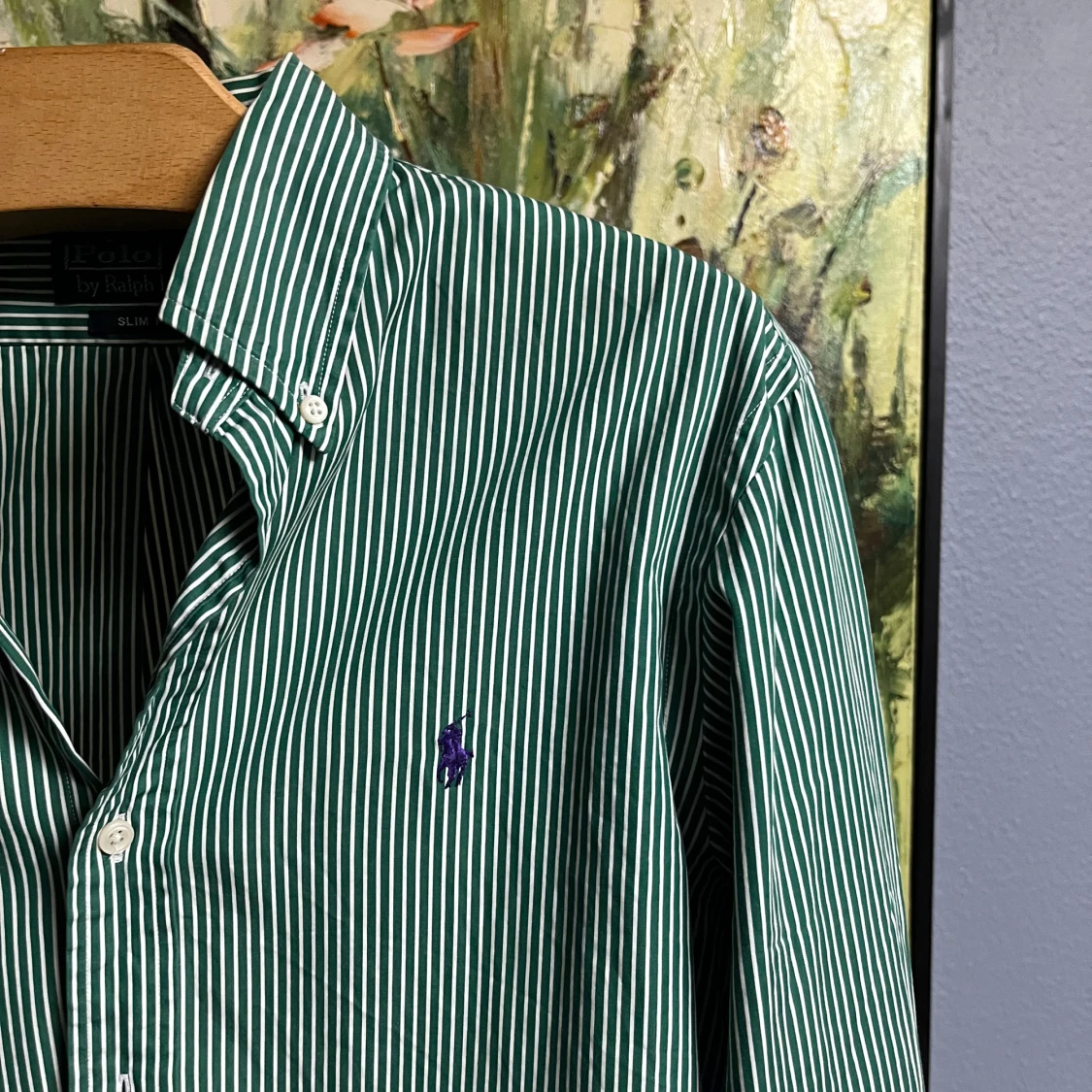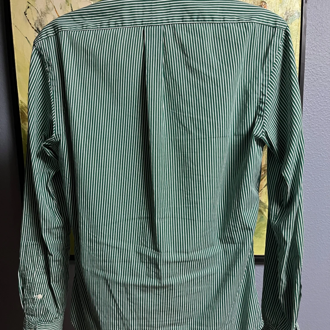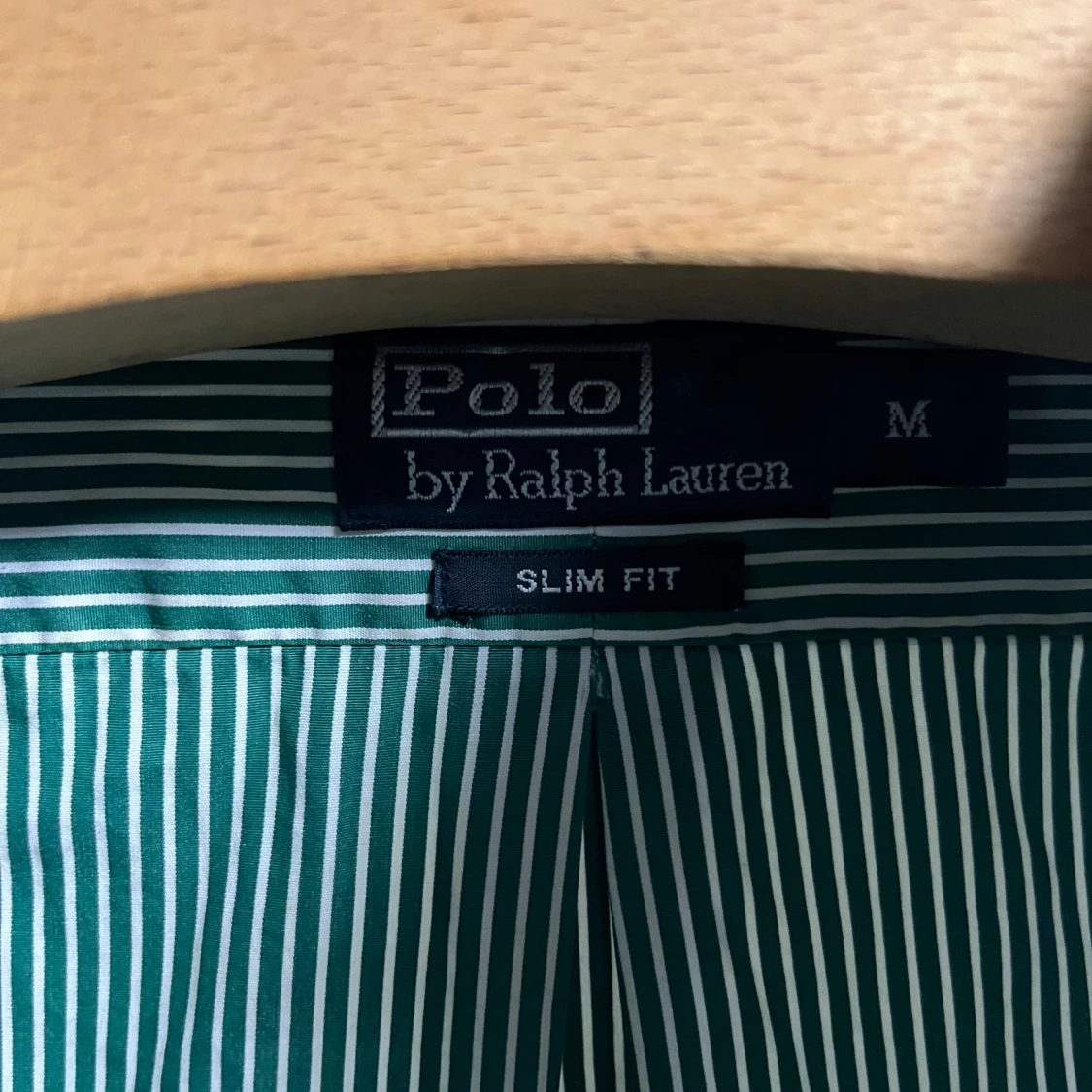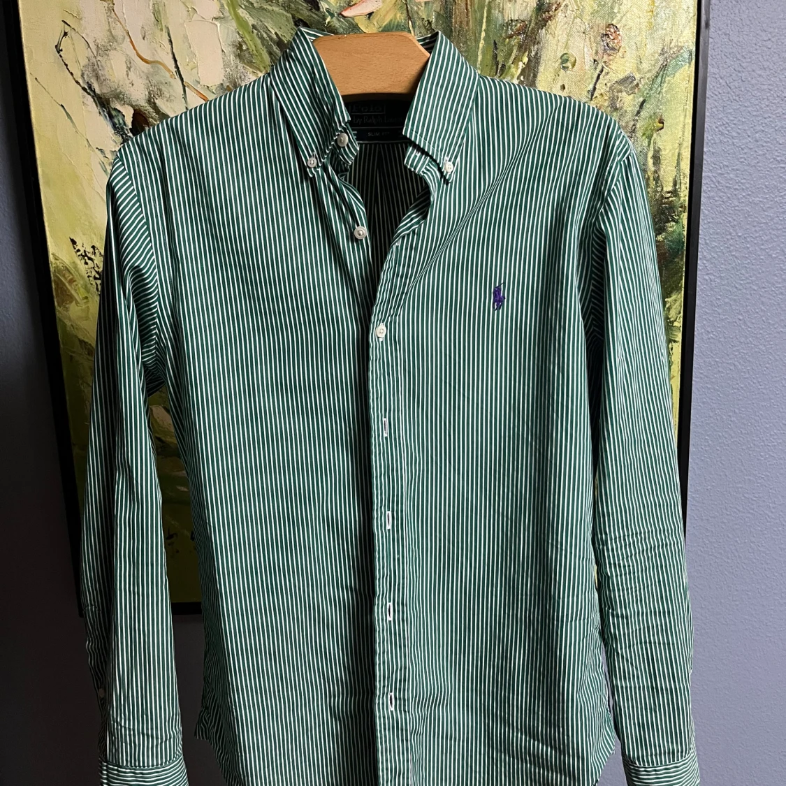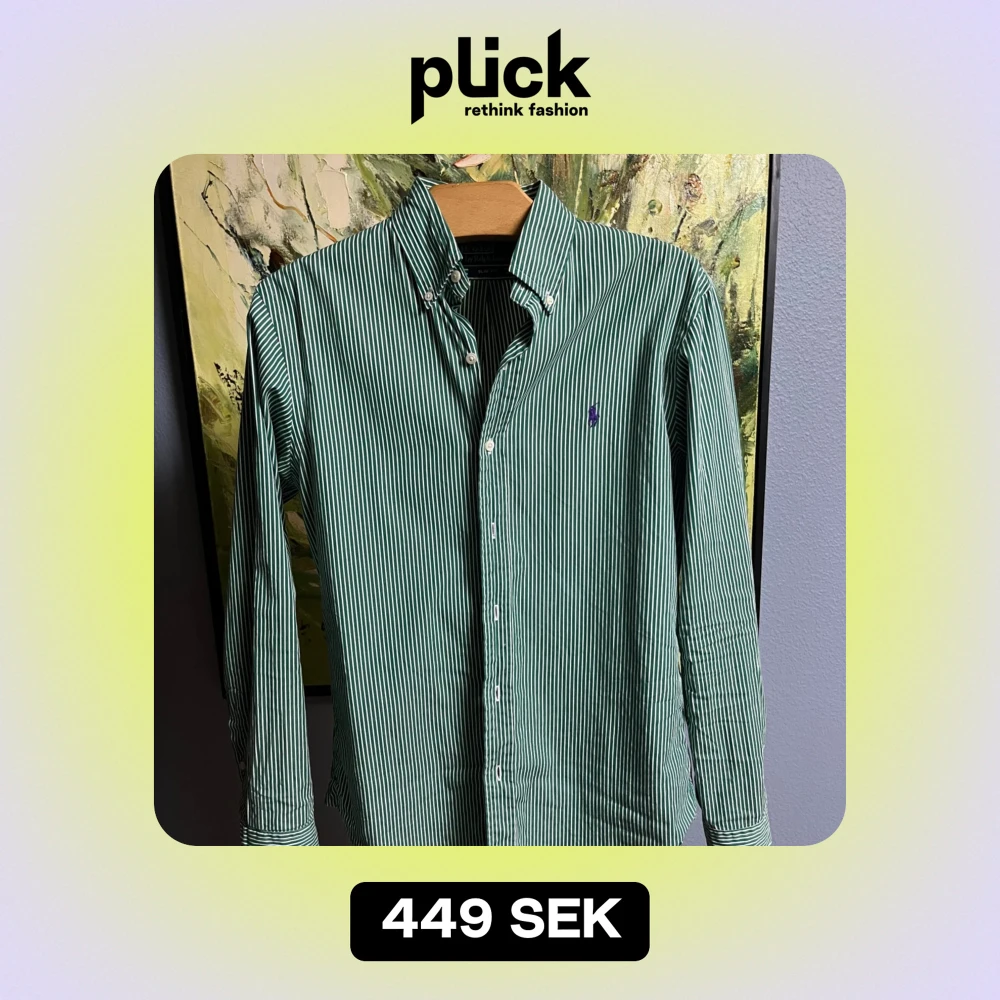 Säljer en snygg grön och vit randig skjorta från Polo Ralph Lauren i storlek M. Skjortan är slim fit och har långa ärmar med knappar. Perfekt för både vardag och fest! 💚