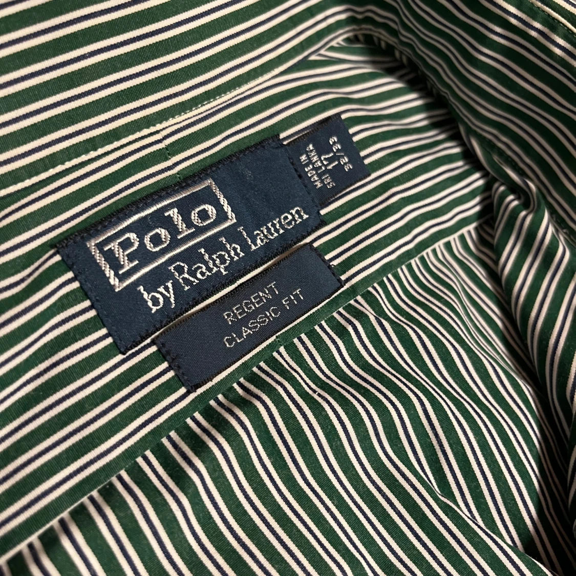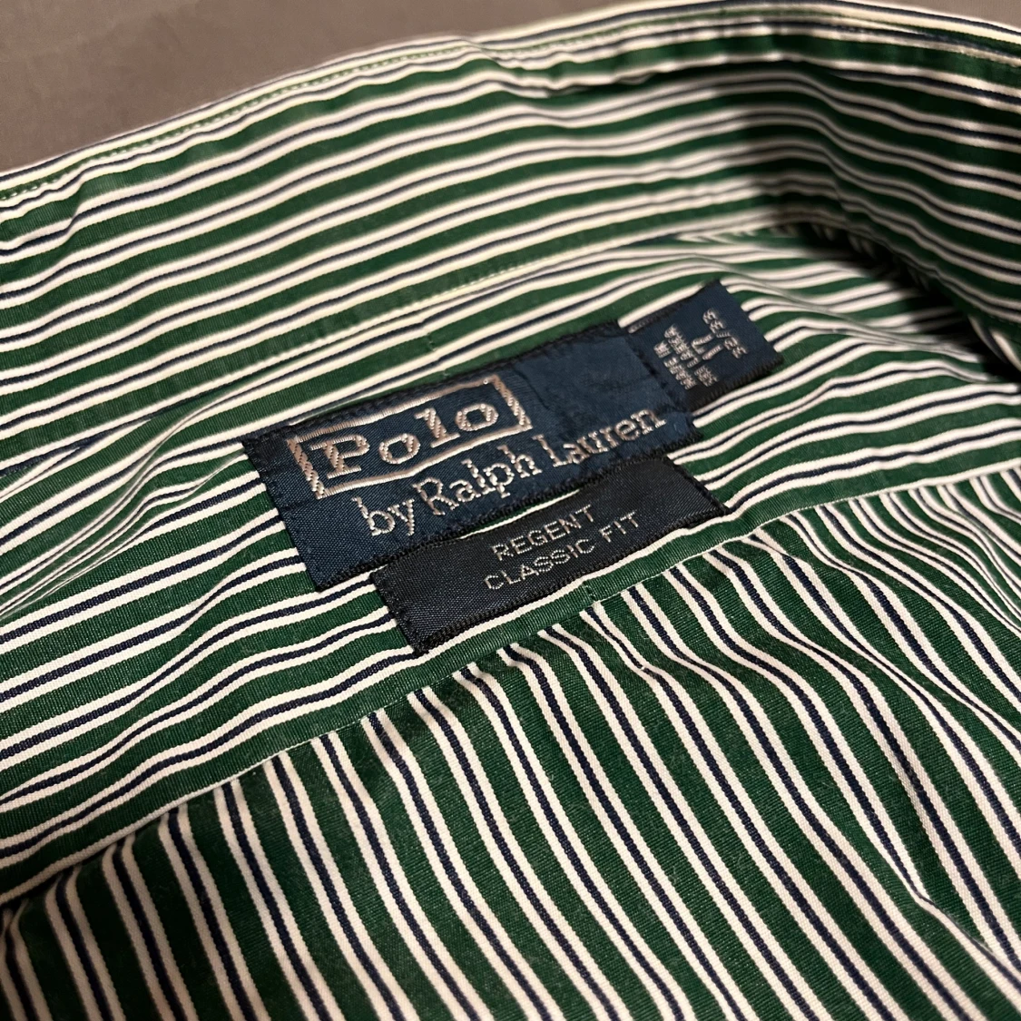 Snygg grön och vit randig skjorta från Polo Ralph Lauren, modell Regent Classic Fit. Skjortan har klassisk krage, långa ärmar med manschett och vita knappar framtill. Perfekt för dig som gillar stilrena och tidlösa plagg med en fräsch vibe.