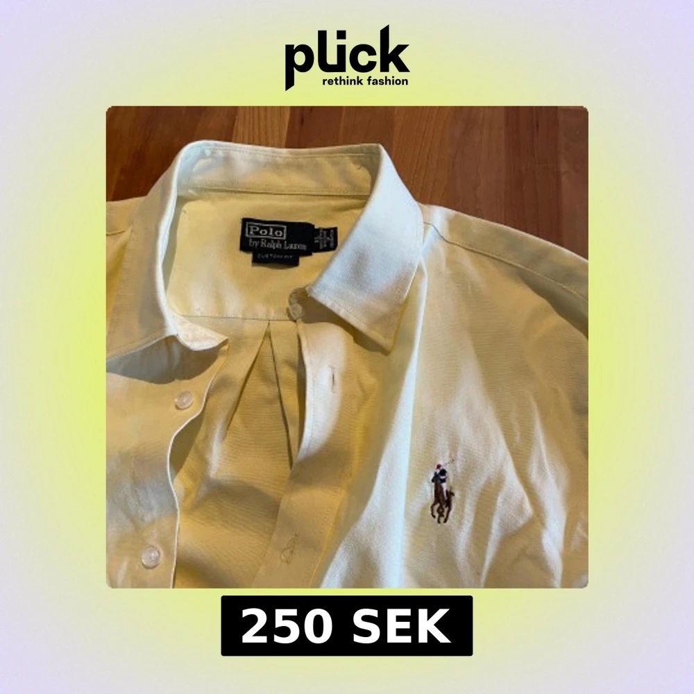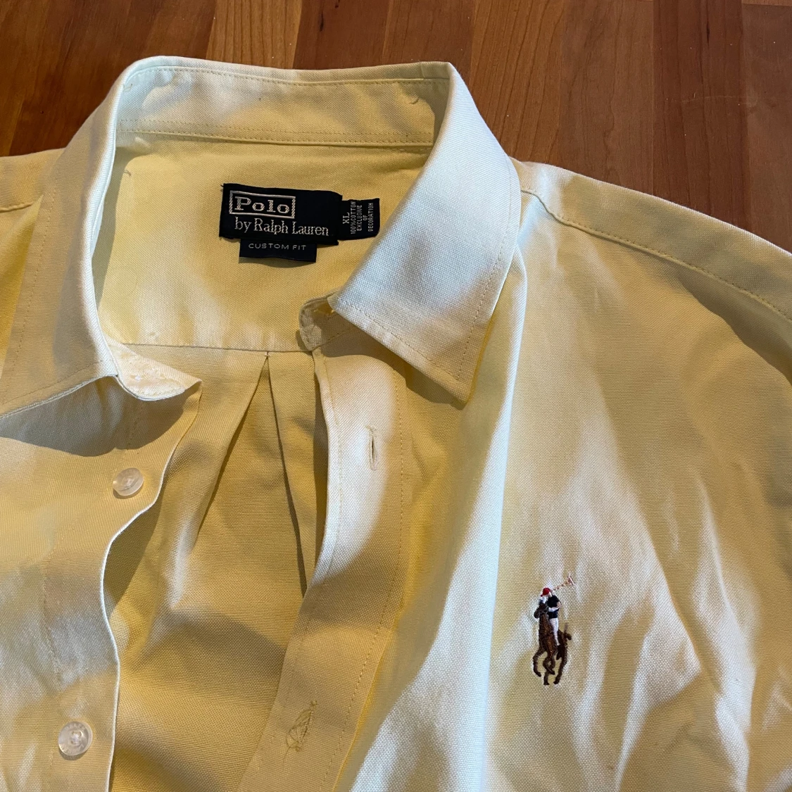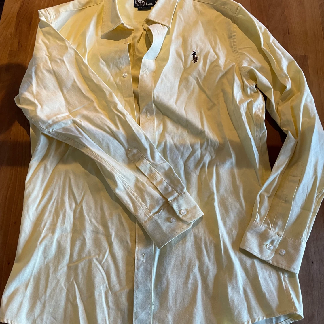 Klassisk ljusgul skjorta från Polo Ralph Lauren med broderad logga på bröstet. Skjortan har lång ärm, knappar framtill och är tillverkad i mjuk bomull. Snygg passform och tidlös design som funkar till många stilar. Storleken är XL men passar fint på mig som vanligtvis bär L