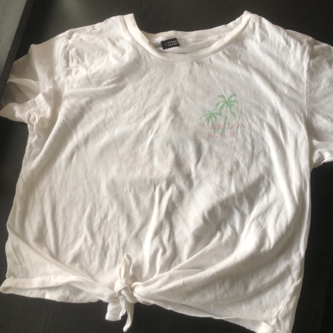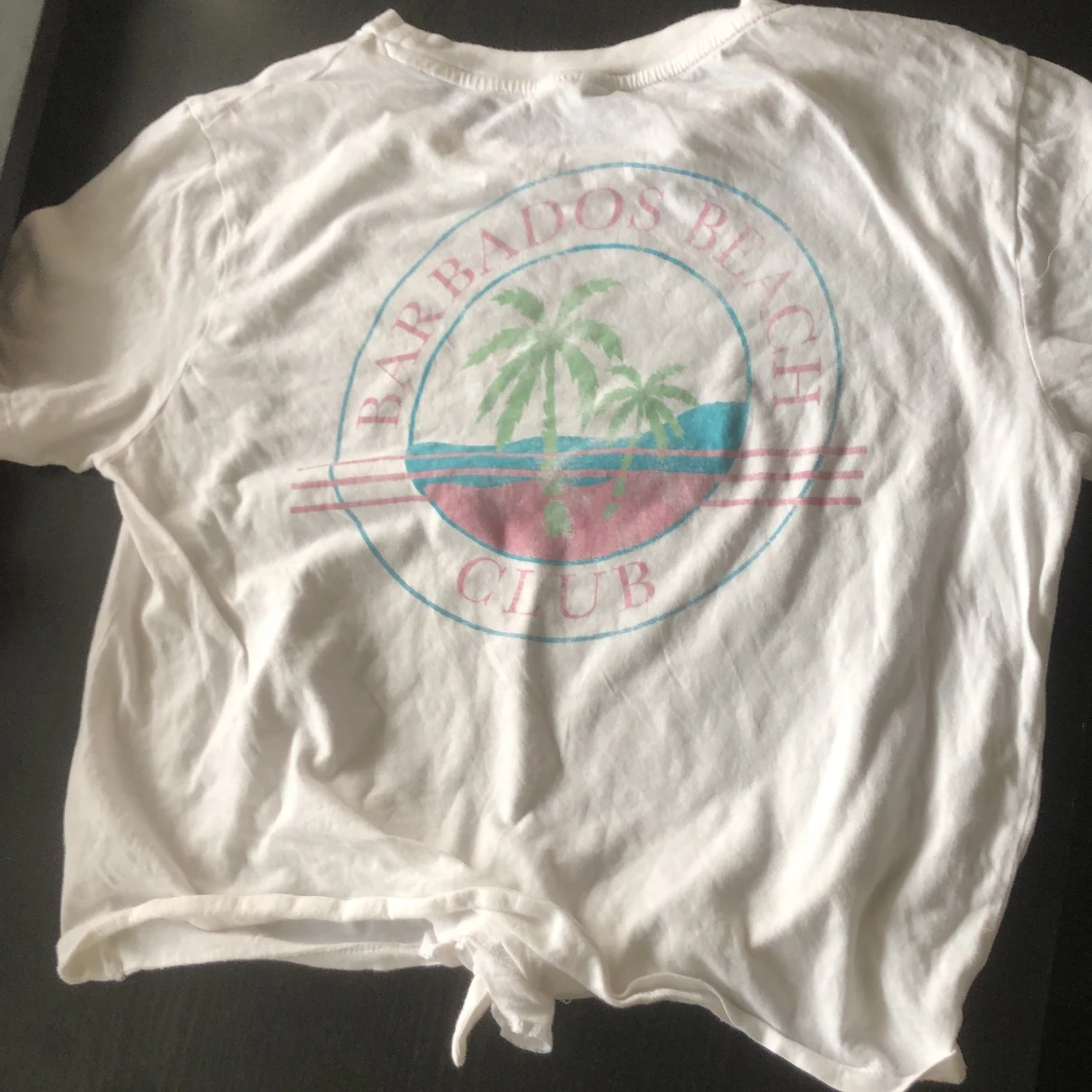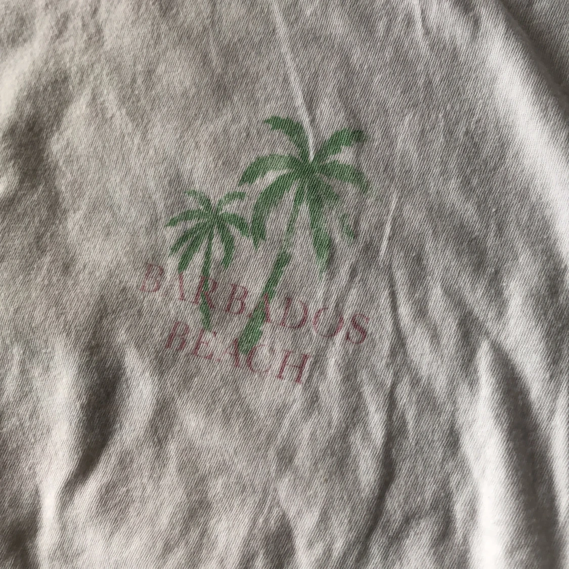 A white crop top with a graphic design on the back (it says Barbados Beach Club, Barbados Beach on front). Size M, from H&M originally.