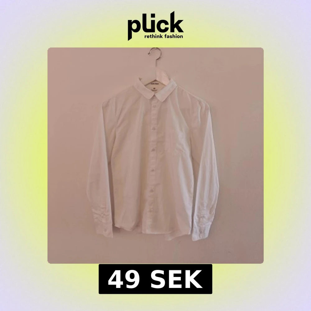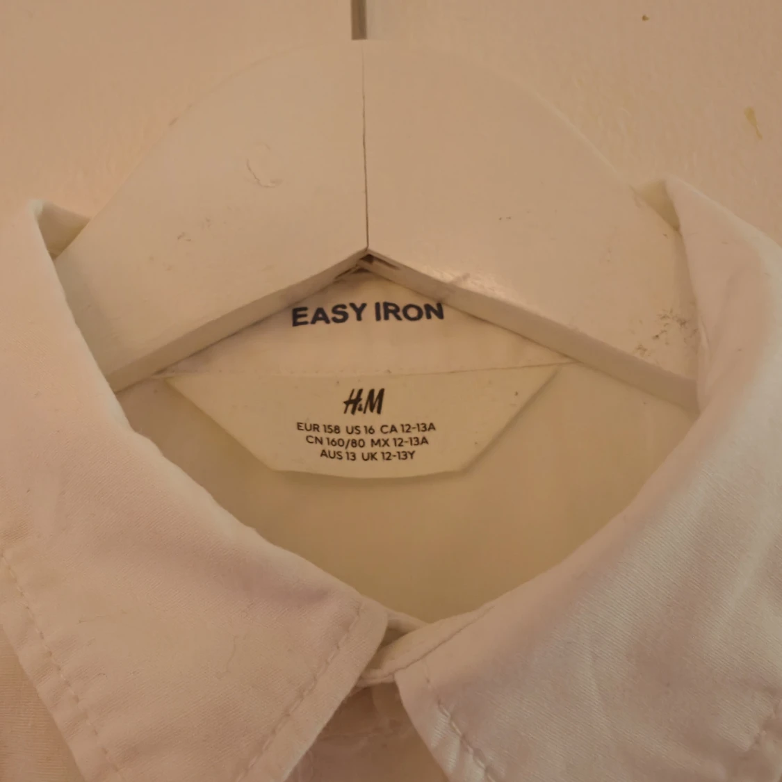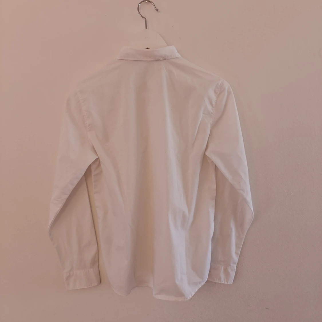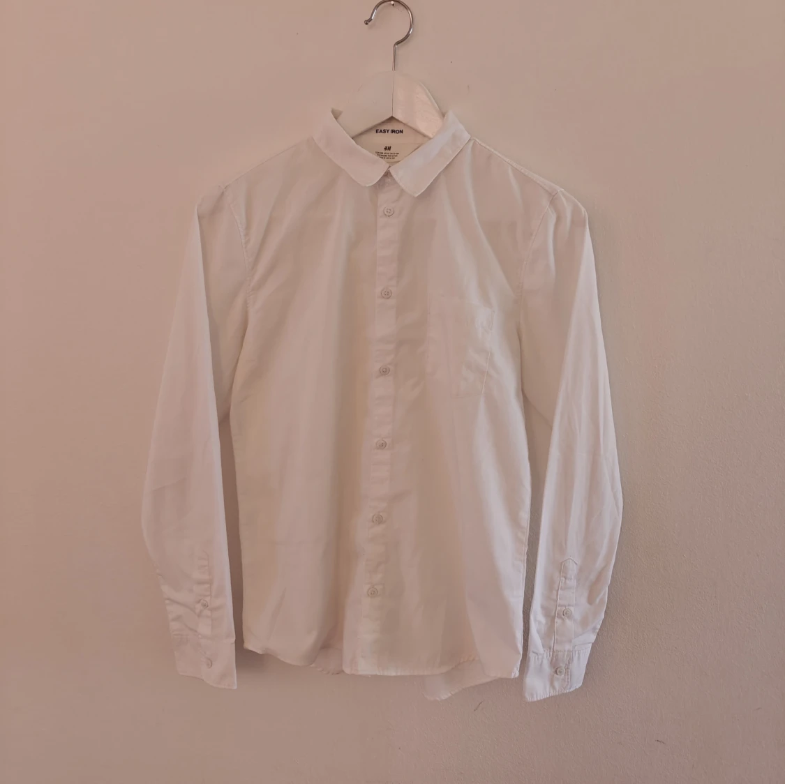 Snygg vit skjorta från H&M med klassisk krage och knappar hela vägen framtill. Tillverkad i en skön mix av polyester och bomull som är lätt att stryka. Långärmad modell med enkel bröstficka, perfekt för en clean och stilren look.