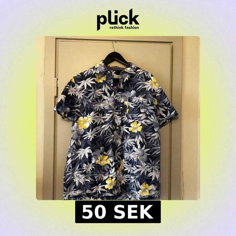 Säljer en snygg blommig skjorta från dressman i storlek XL. Skjortan har ett tropiskt mönster med gula och vita blommor på en mörkblå bakgrund.