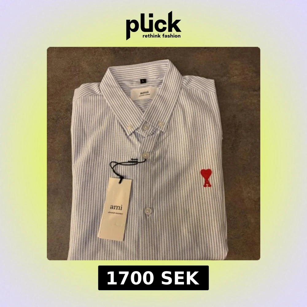 Säljer en klassisk blårandig skjorta från Ami med vit botten och tunna blå ränder. Skjortan har lång ärm, knappar framtill och en röd broderad logga med hjärta på bröstet. Perfekt för en stilren look.