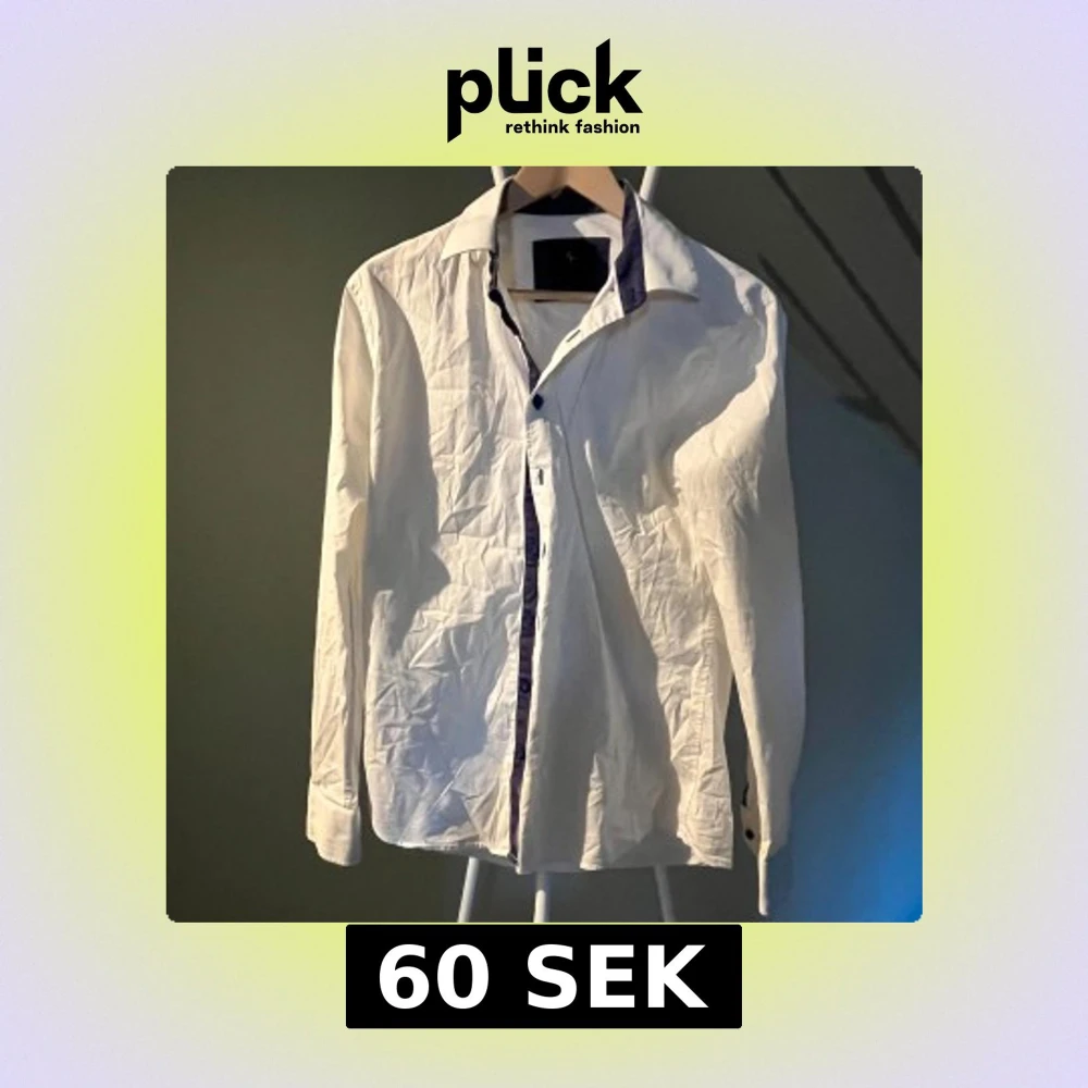 Vit skjorta från Savvy Citizen i storlek medium. Skjortan har lång ärm och blå kontrastdetaljer längs knappslå och krage. Klassisk krage och knäppning framtill, perfekt för en stilren look.