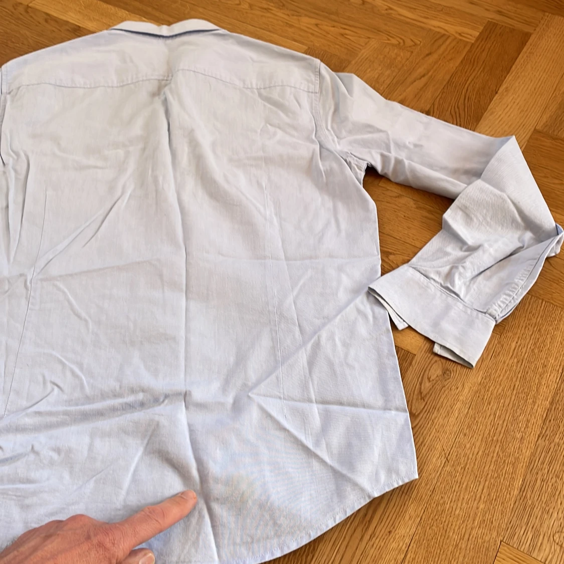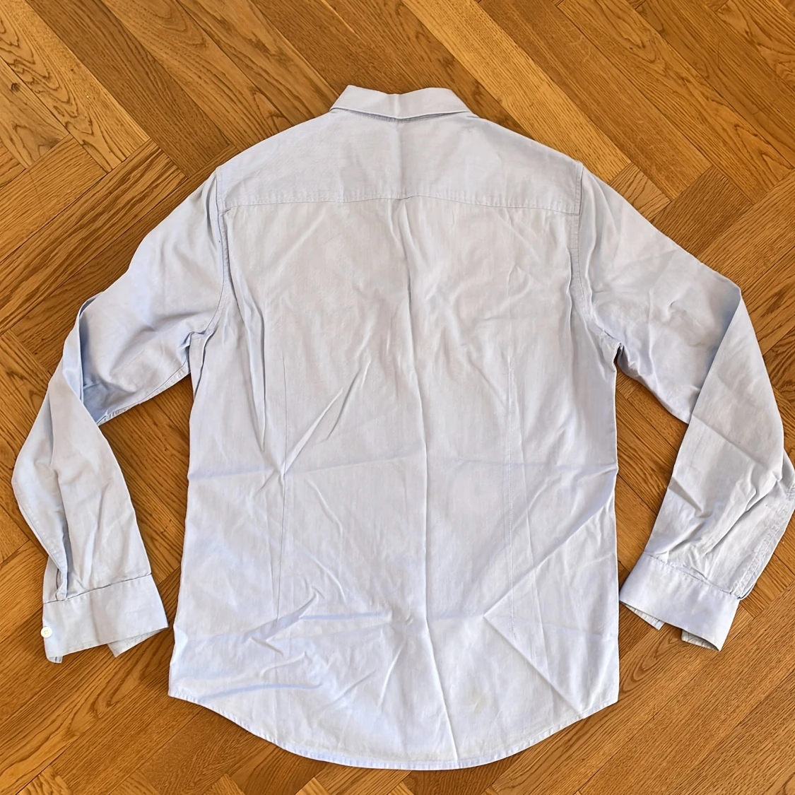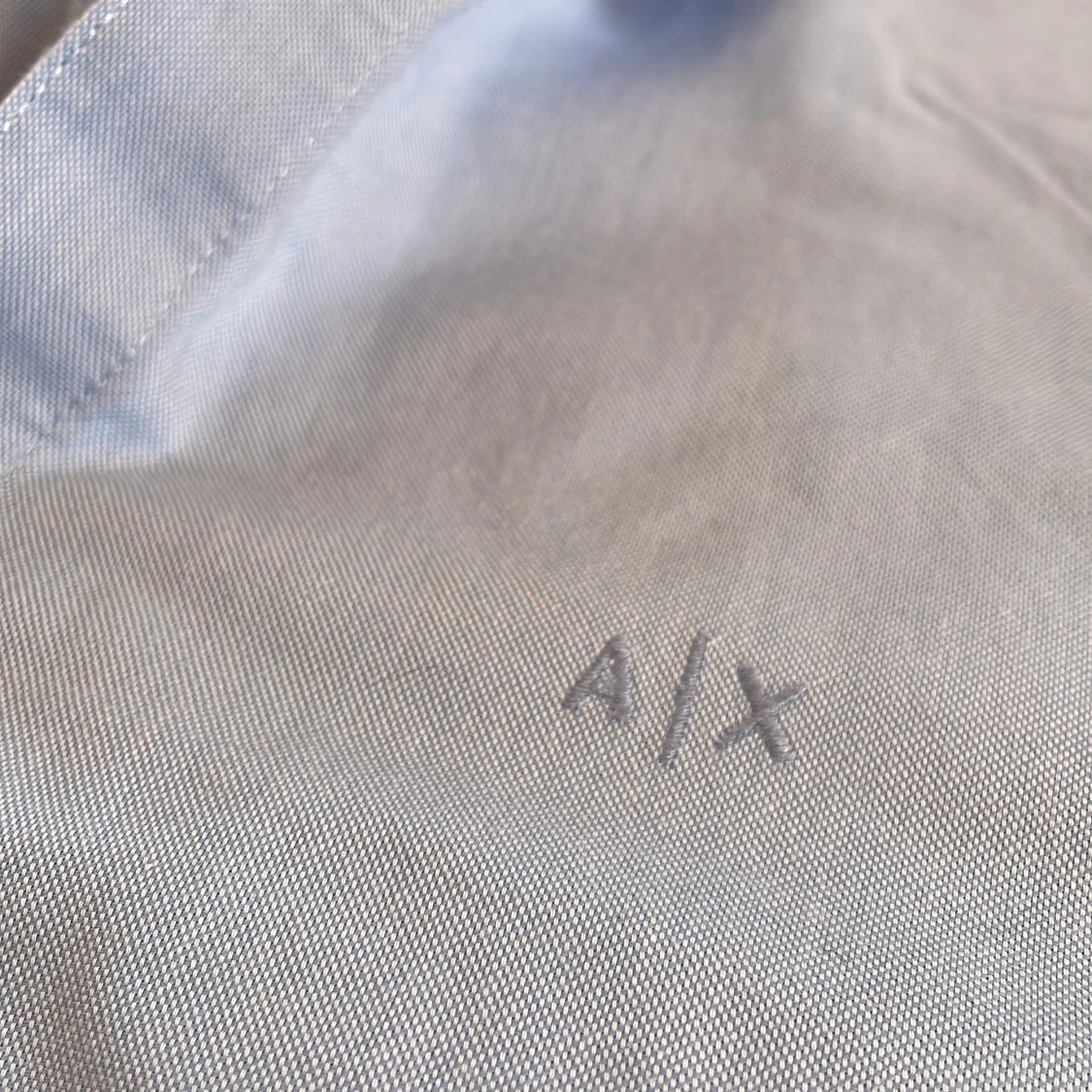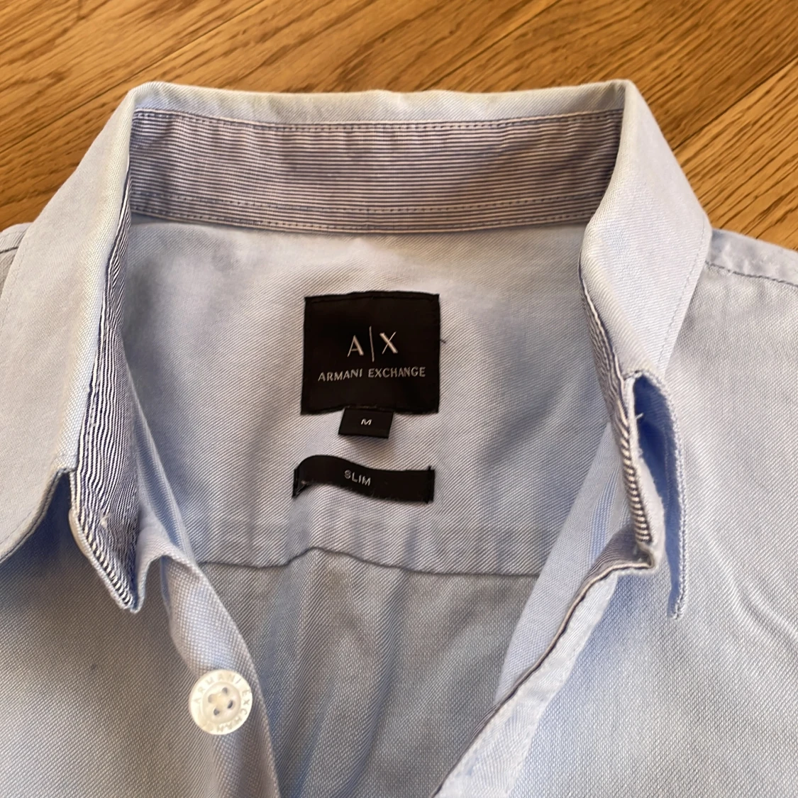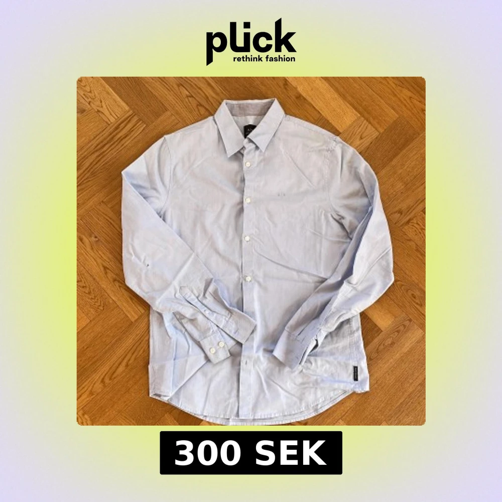 Säljer en stilren ljusblå skjorta från Armani Exchange i storlek M. Skjortan har en klassisk krage och knappar framtill. Den är broderad med A|X-loggan på bröstet och har långa ärmar med knappslå vid ärmsluten. Slim fit. Liten fläck bak och lite solblekt i kragviket