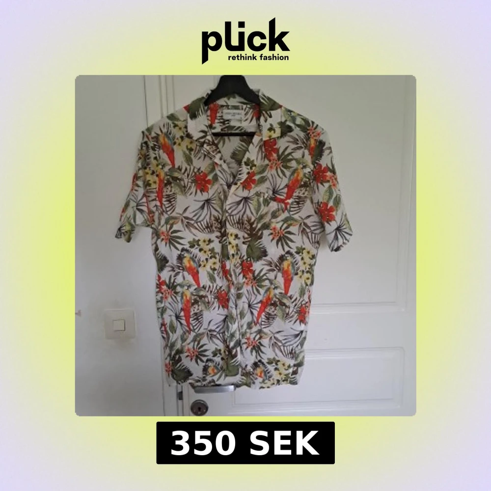 Säljer en färgglad kortärmad skjorta från John Henric med tropiskt blommönster och papegojor i rött, grönt och gult. Skjortan har knappar framtill och är perfekt för sommarens alla äventyr. 🌴🦜