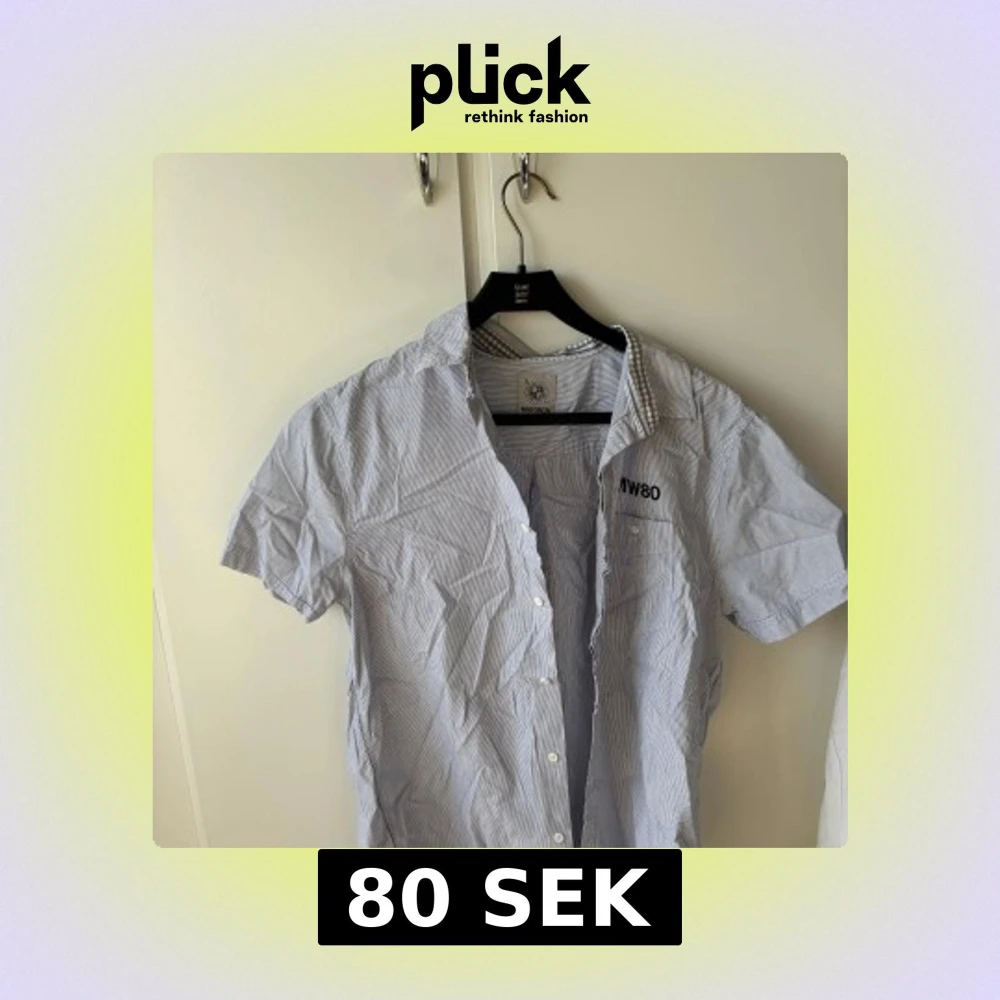 Säljer en ljusblå och vit randig kortärmad skjorta från Marwin. Skjortan har klassisk krage, knappar framtill och diskret broderad text på bröstet. Perfekt för en stilren och avslappnad look.
