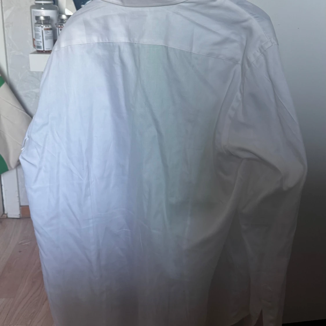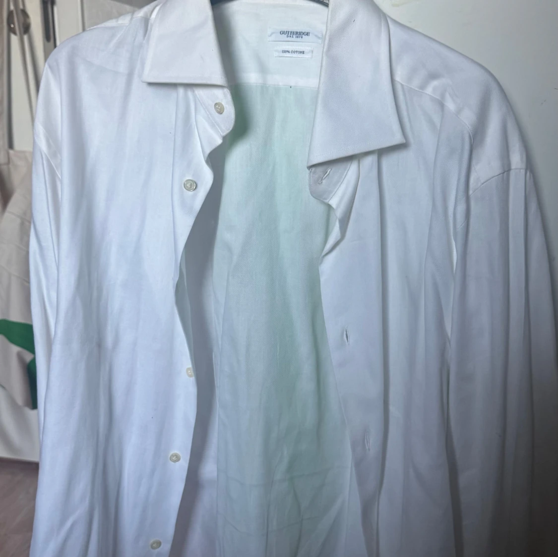 Säljer en klassisk vit skjorta från Gutteridge, tillverkad i 100% bomull. Skjortan har en stilren design med knappar framtill och en traditionell krage. Perfekt för en elegant look.