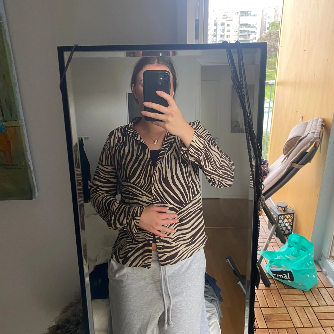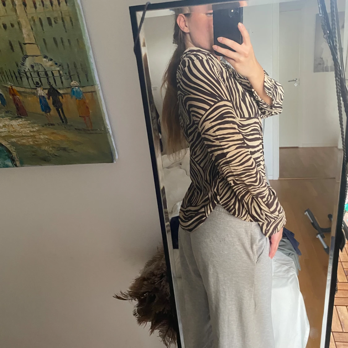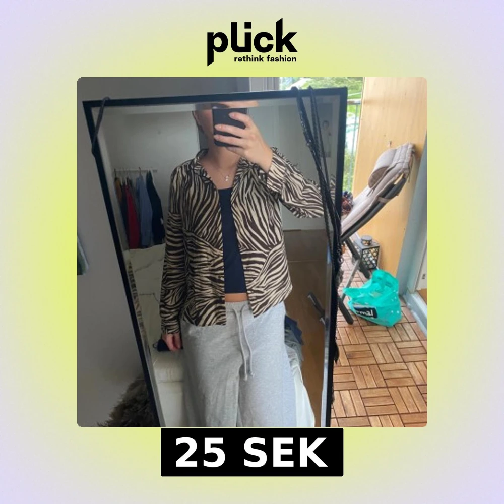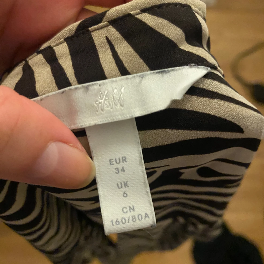 Säljer en snygg zebramönstrad skjorta från H&M i storlek 34. Skjortan har svart och beige mönster, klassisk krage och knäppning framtill. Långärmad och i ett mjukt, lätt material som känns skönt mot huden. Perfekt för dig som vill sticka ut lite extra.