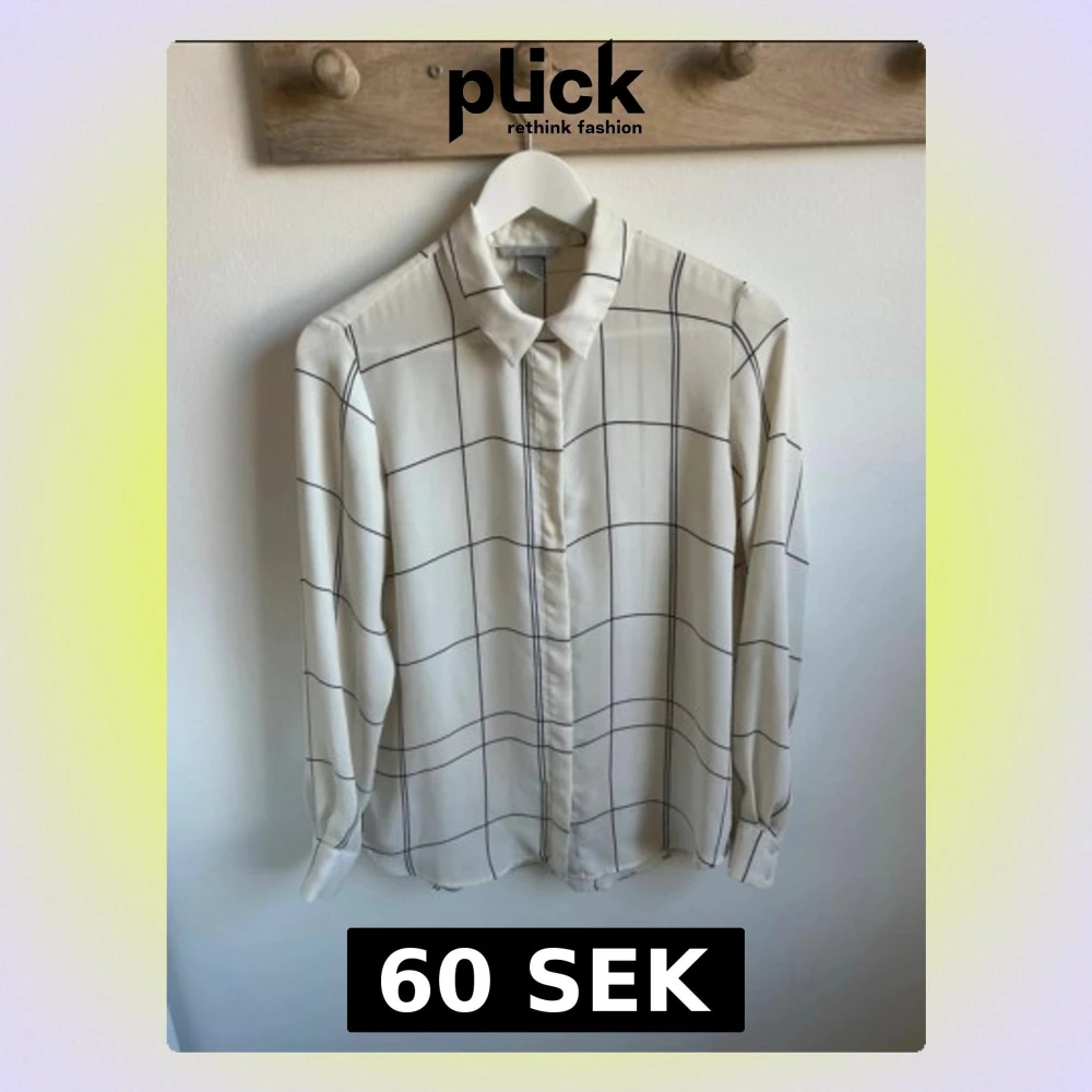 Snygg vit skjorta från H&M i storlek 36 med svart rutigt mönster. Skjortan har klassisk krage, långa ärmar och dolda knappar framtill. Materialet är mjukt och lätt polyester, perfekt för en clean och stilren look.