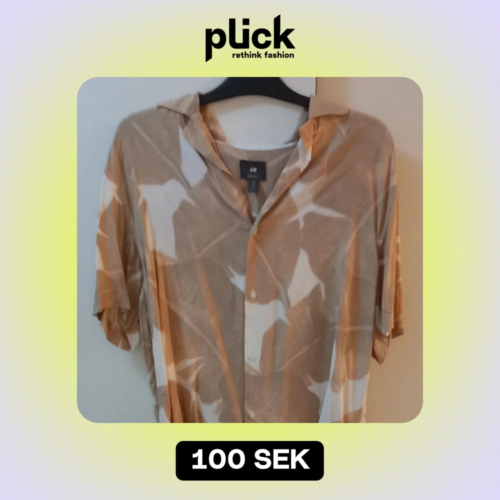 Säljer en snygg beige och vit skjorta från H&M med ett abstrakt mönster. Skjortan har korta ärmar och knappar framtill. Perfekt för sommardagar eller en avslappnad fest. Materialet känns lätt och luftigt, vilket gör den idealisk för varmare väder. Passar bra till både jeans och shorts!