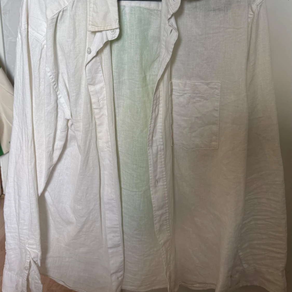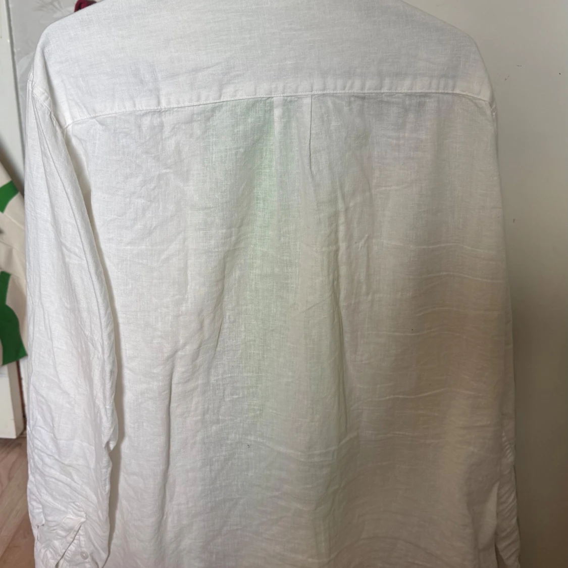 Säljer en vit långärmad skjorta från H&M i relaxed fit. Skjortan har en klassisk krage och en bröstficka. Perfekt för en stilren och avslappnad look.