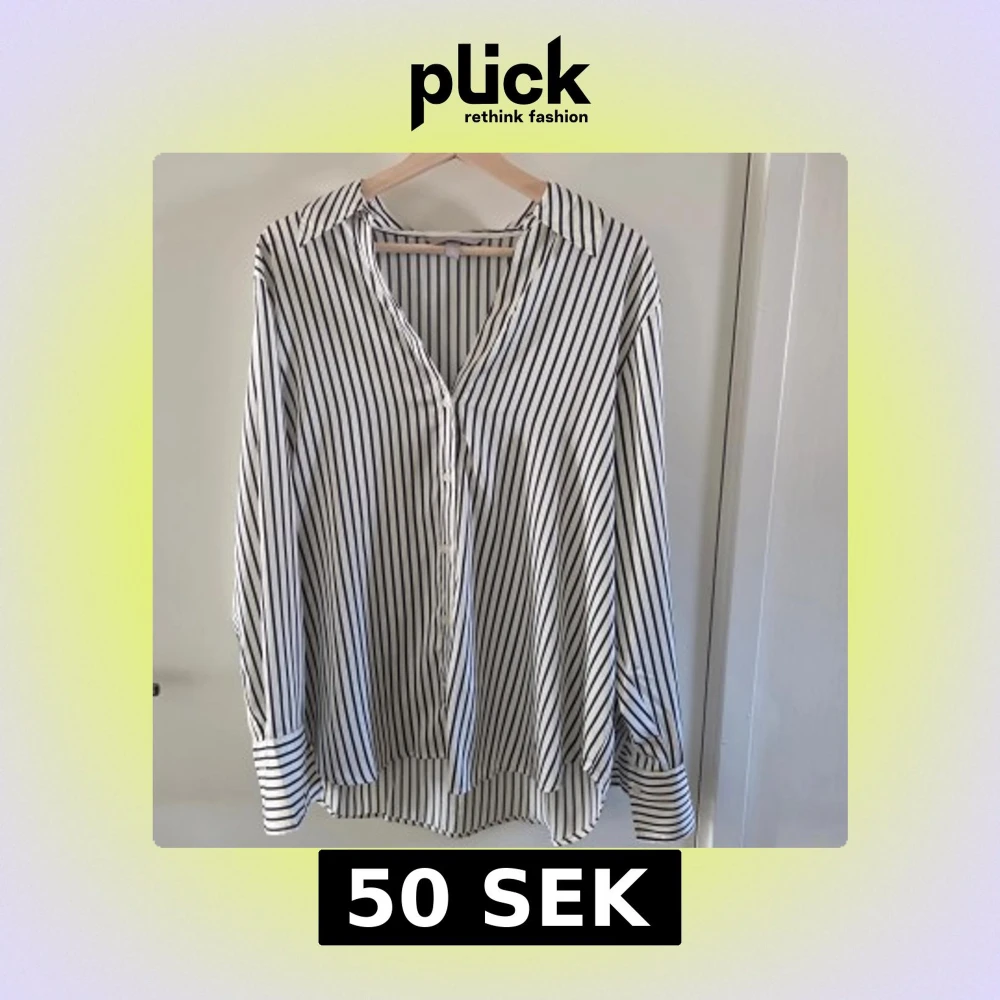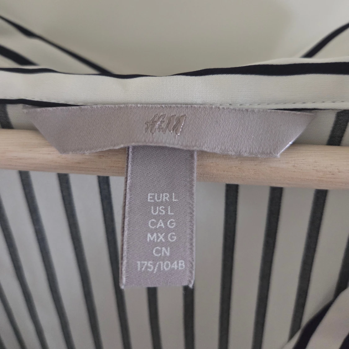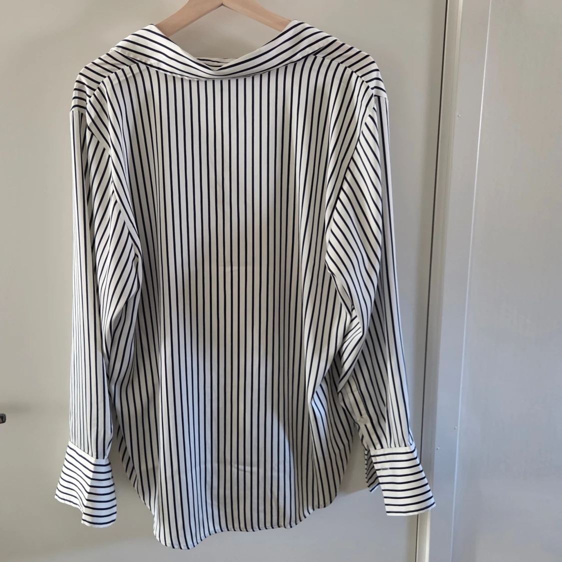 Vit skjorta från H&M med svarta vertikala ränder och klassisk krage. Skjortan har långa ärmar med breda manschetter och knäppning framtill. Luftig och loose fit, perfekt för en chill och stilren look.