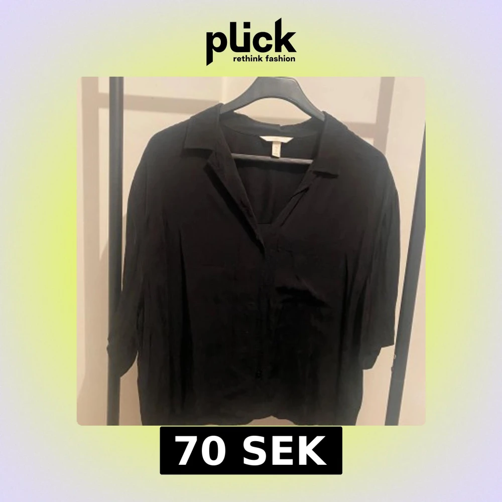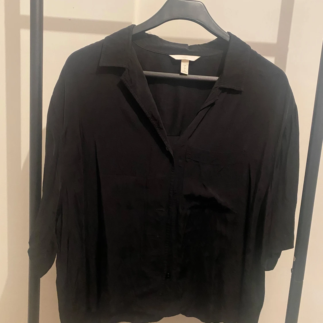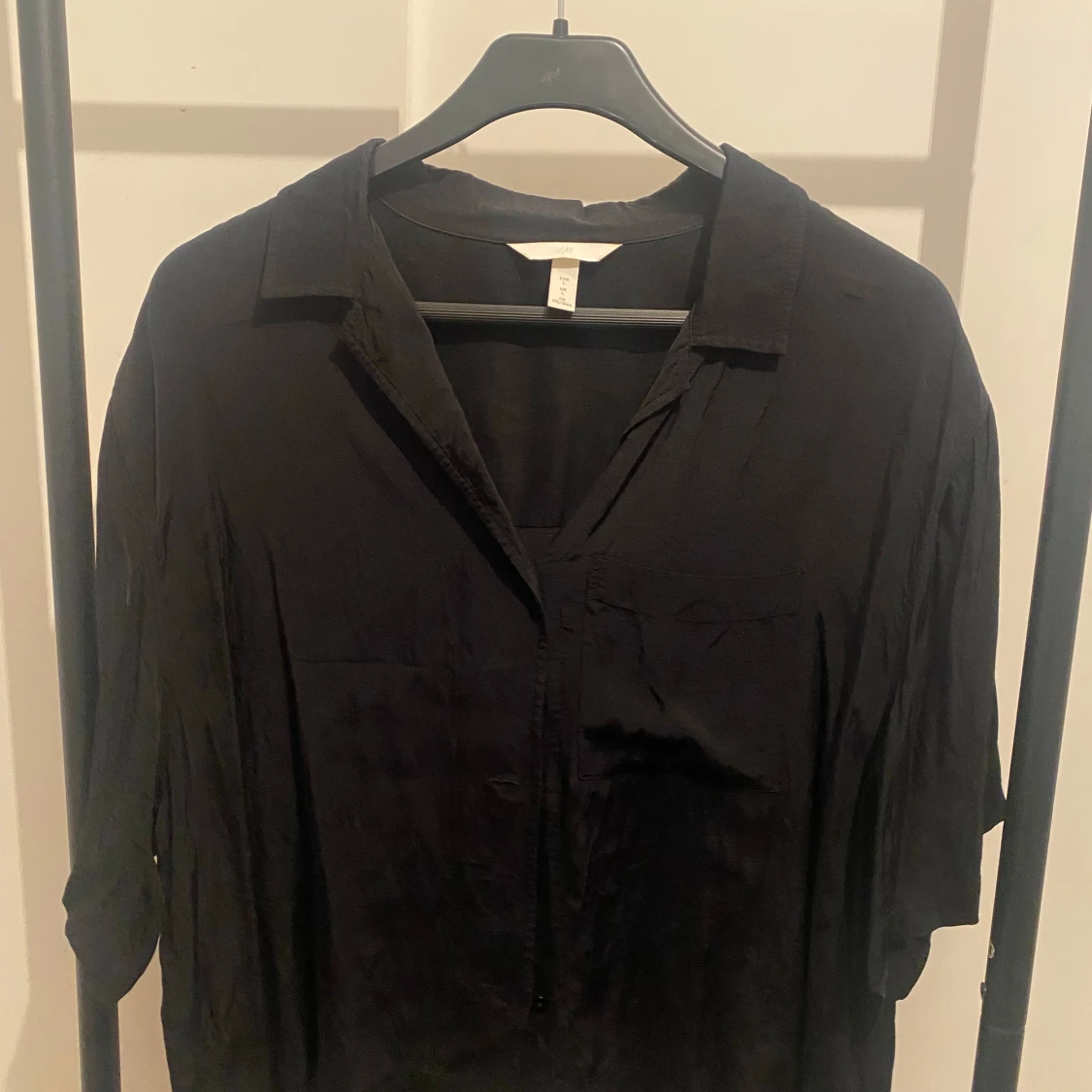 Svart skjorta från H&M i storlek L. Skjortan har klassisk krage, knappar framtill och en bröstficka. Modellen är lite loose och har lång ärm. Perfekt att styla med jeans eller dressade byxor.