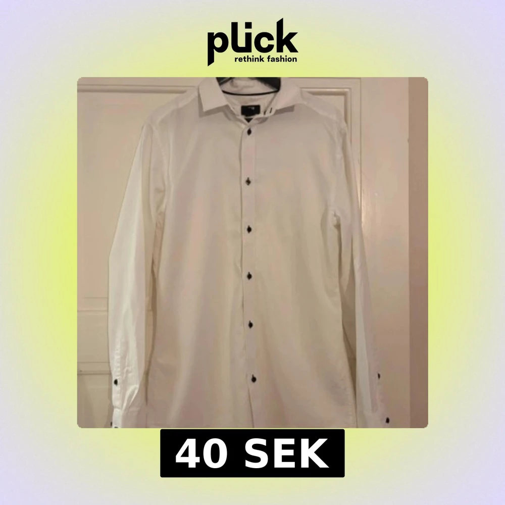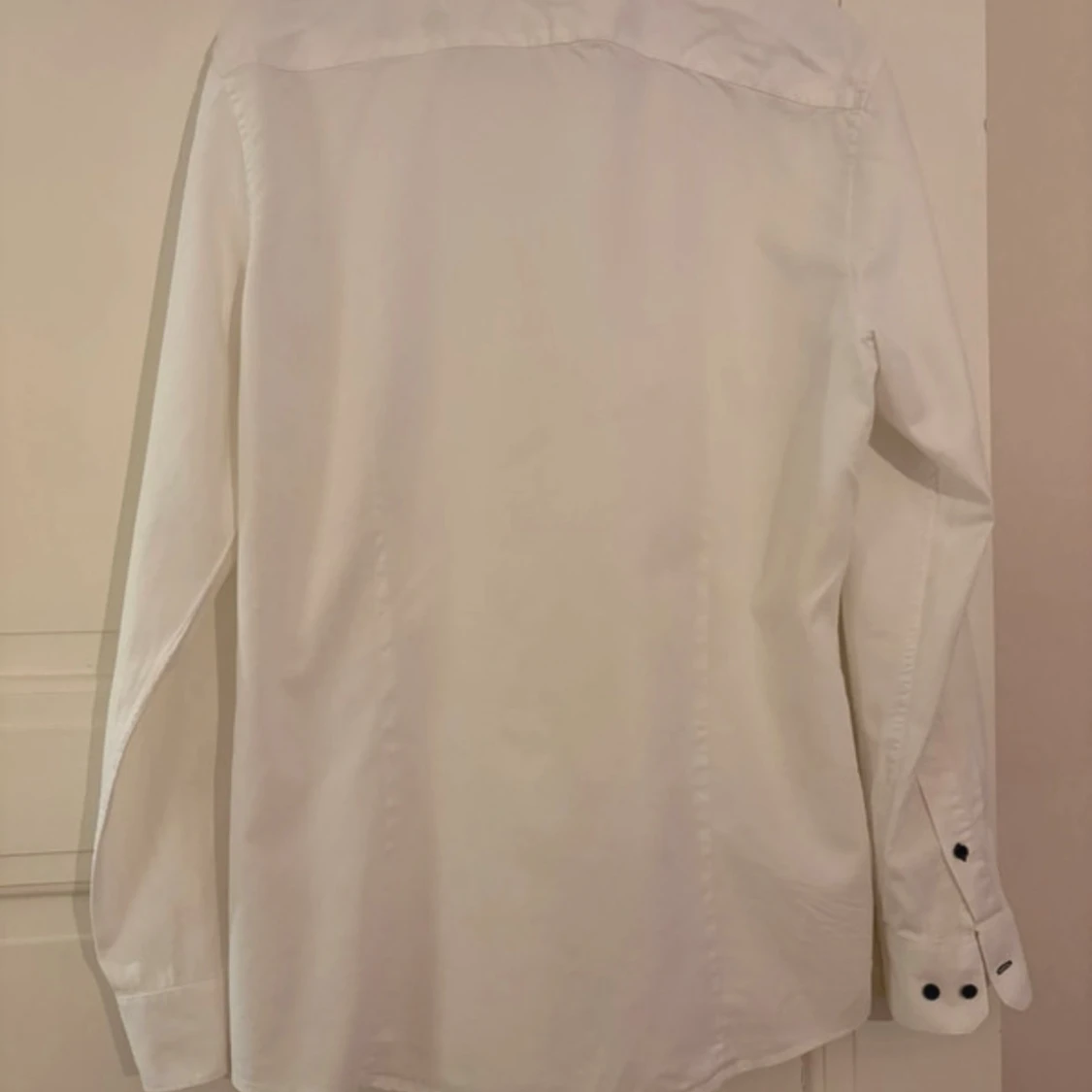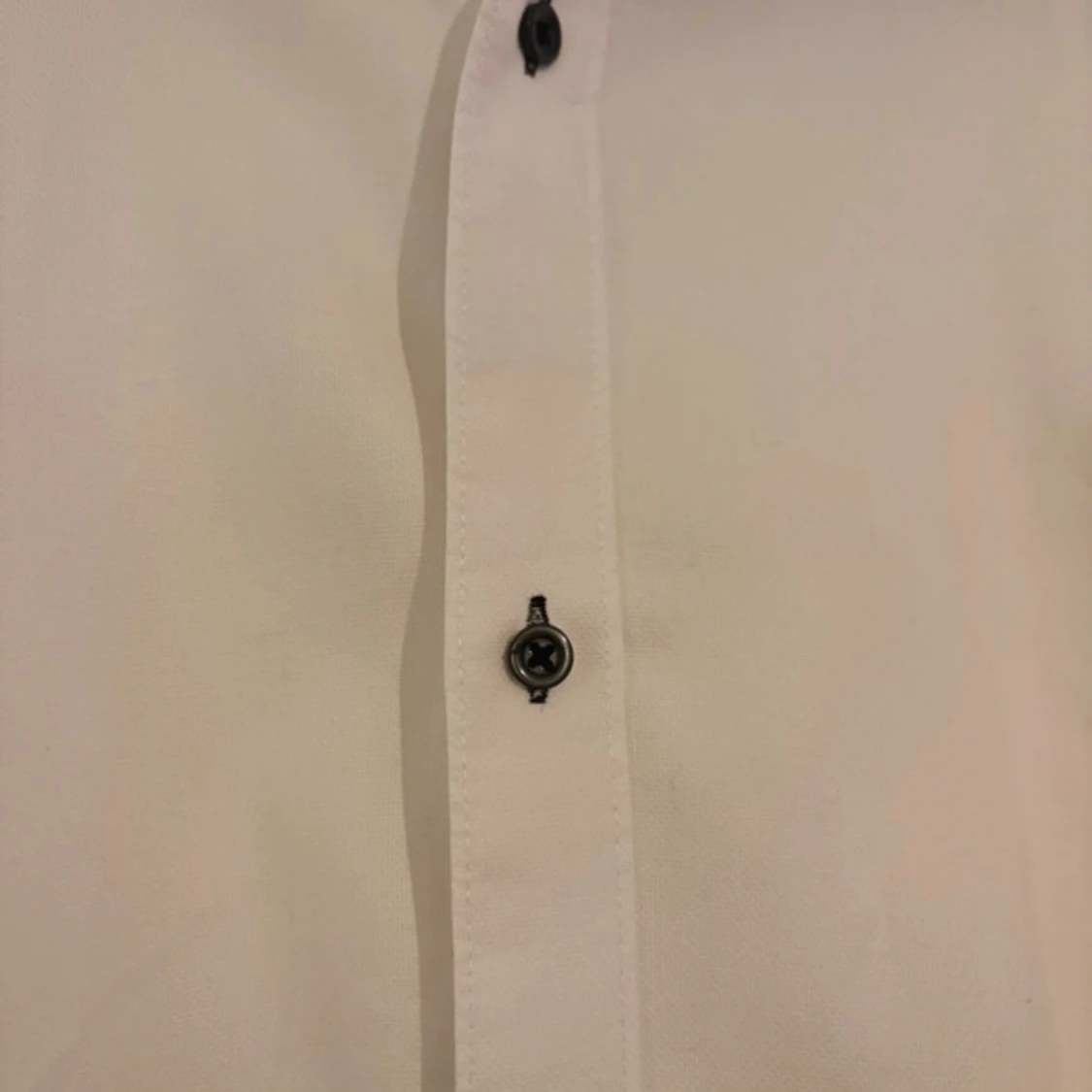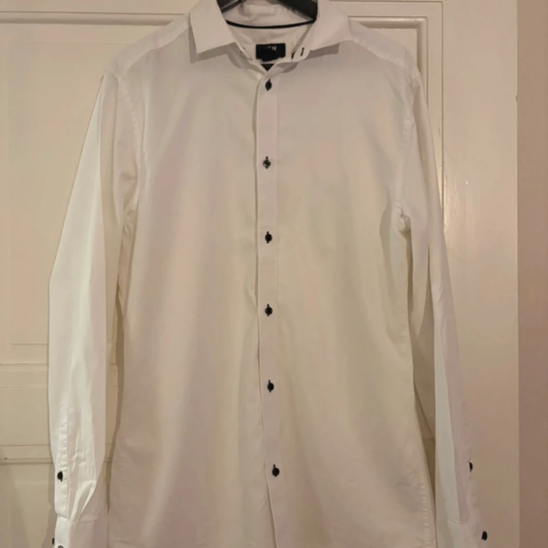 Klassisk vit skjorta från H&M med svarta knappar som ger en snygg kontrast. Skjortan har lång ärm, normal passform och är tillverkad i bomull. Perfekt för dig som gillar stilrena och enkla plagg med en twist.