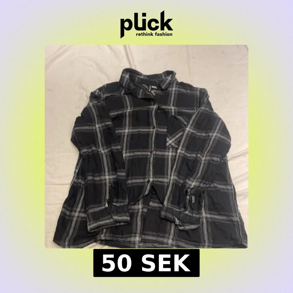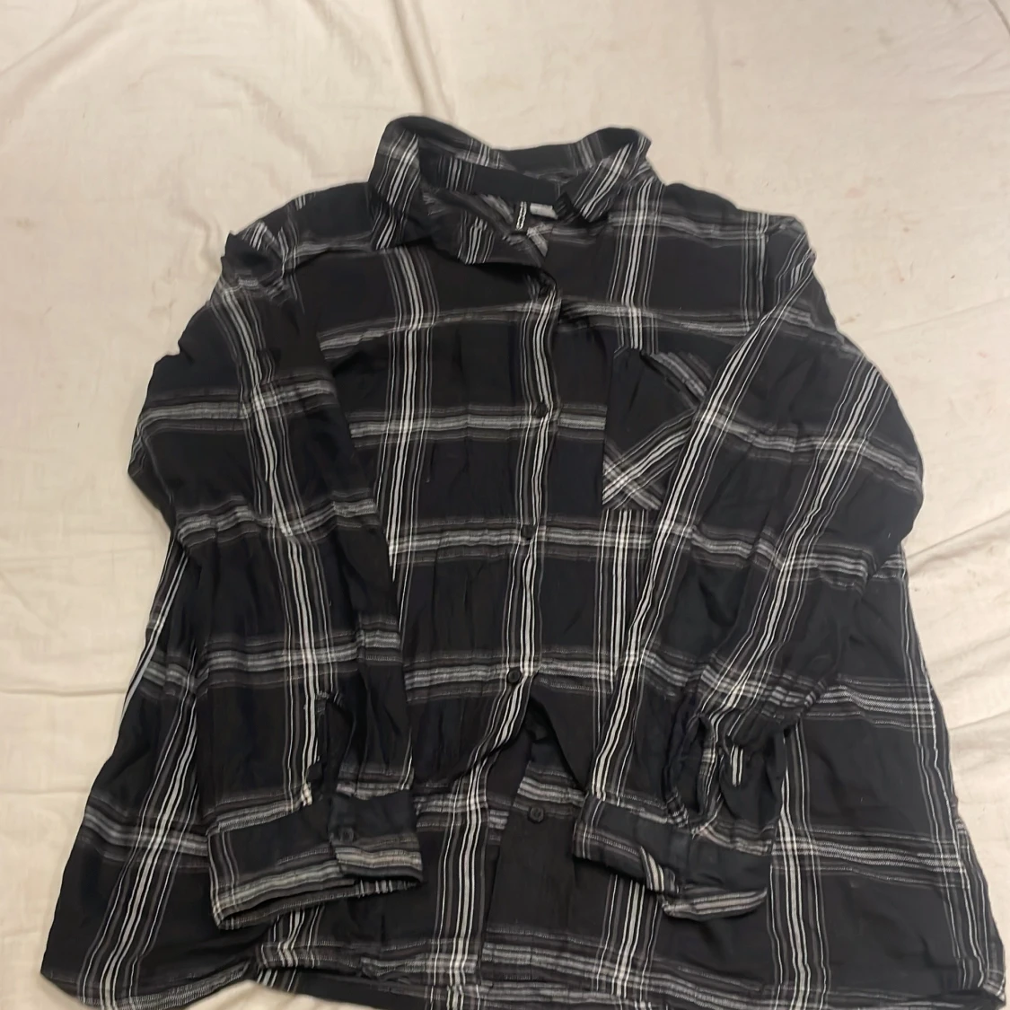 Säljer en svart och vit rutig skjorta med långa ärmar. Skjortan har en klassisk krage och knappar framtill. Perfekt för en avslappnad stil.