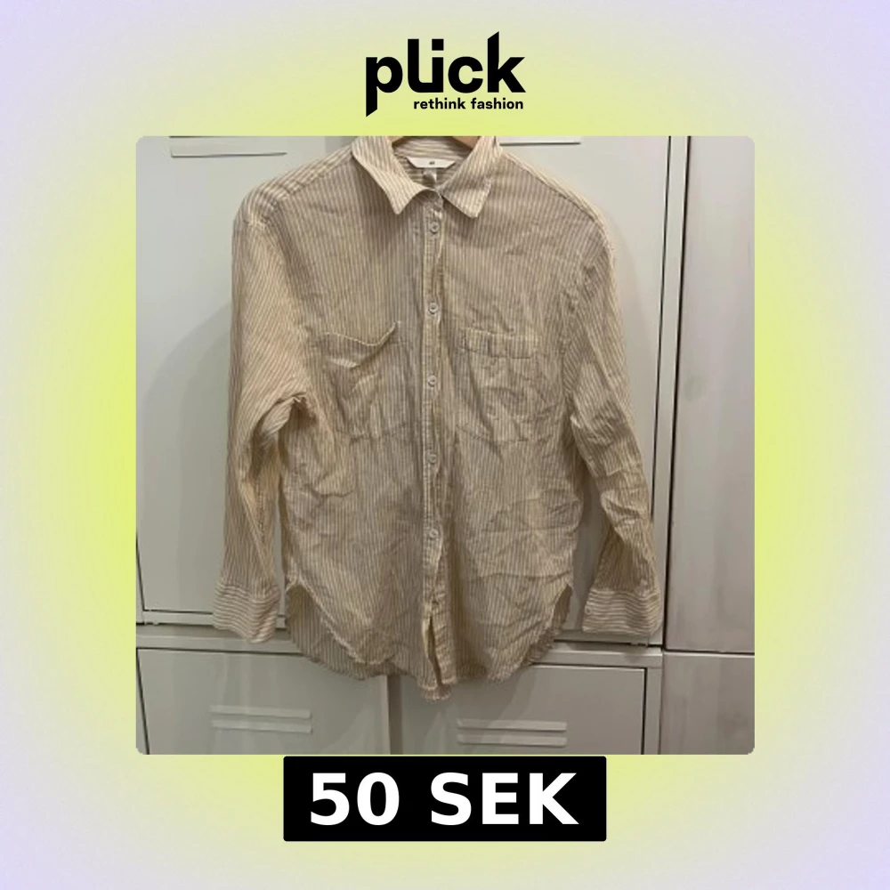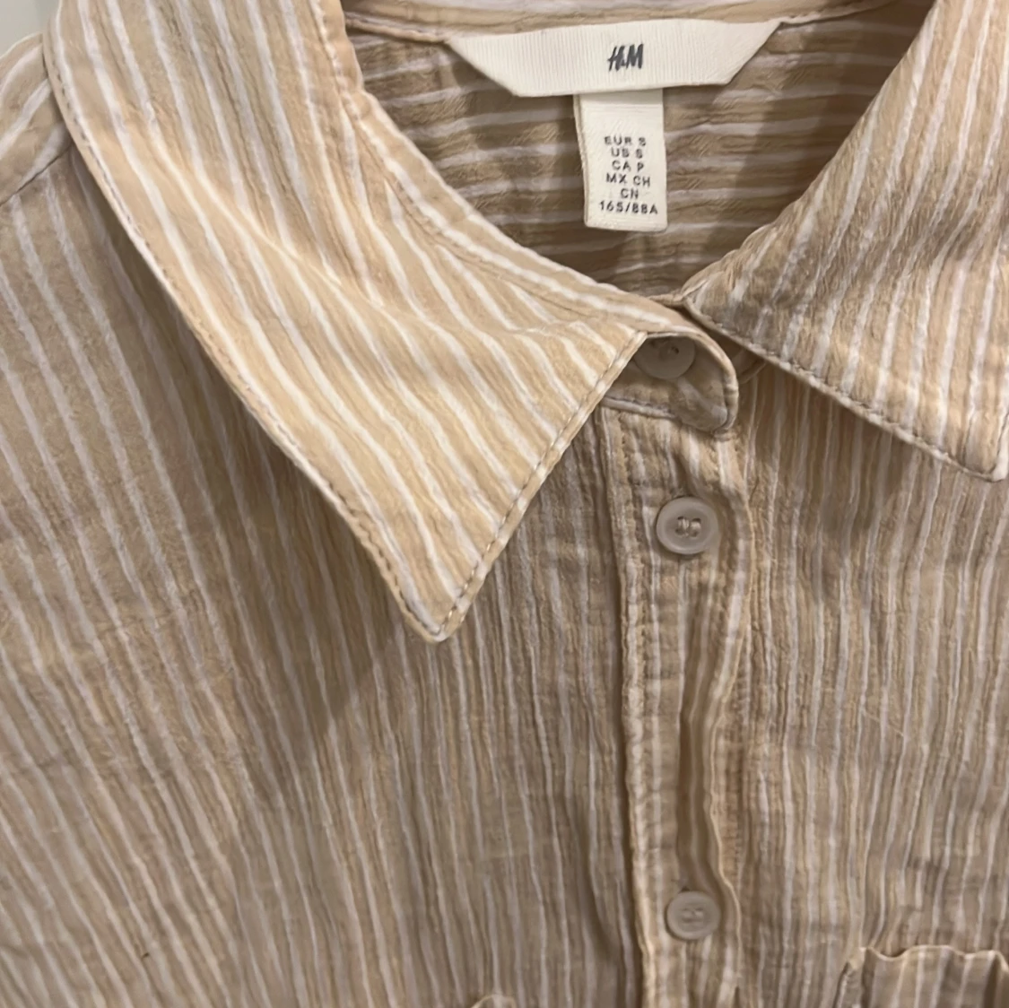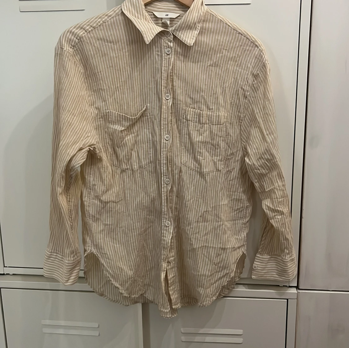 Säljer en beige och vit randig skjorta från H&M i 100% bomull. Skjortan har klassisk krage, knäppning framtill, två bröstfickor och långa ärmar. Perfekt för en chill och avslappnad stil.