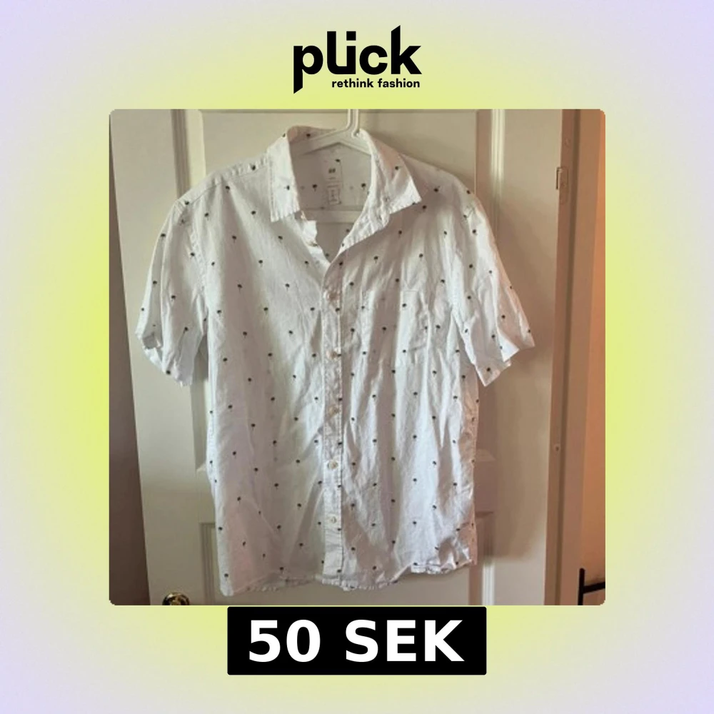 Vit skjorta från H&M med korta ärmar och små svarta palmträd som mönster. Skjortan har klassisk krage, bröstficka och knäppning framtill. Perfekt för sommarens chill dagar och ger en avslappnad vibe.