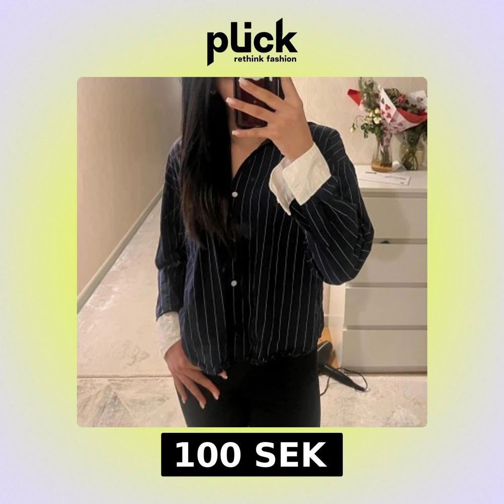 Snygg marinblå skjorta med vita ränder och kontrasterande vita manschetter och krage. Skjortan har en avslappnad passform och knappar framtill. Perfekt för en stilren look.