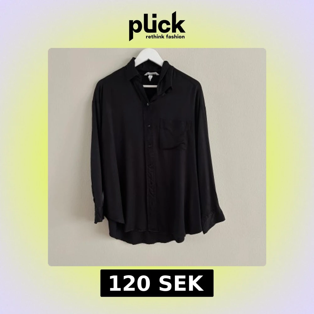 Stilren svart skjorta med oversized passform och lång ärm. Skjortan har klassisk krage, bröstficka och knäppning framtill. Materialet har en lätt glansig satin-look som ger en cool vibe. Perfekt att styla lager på lager eller bära som den är.