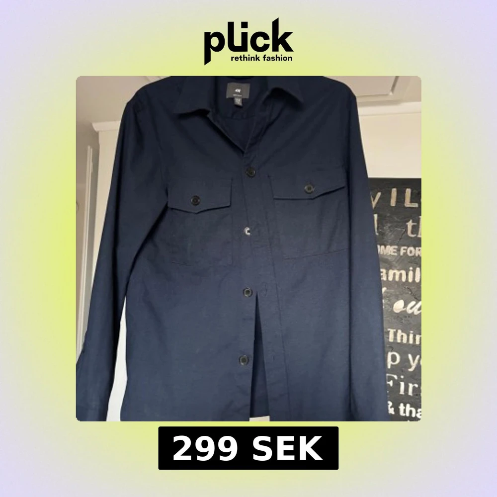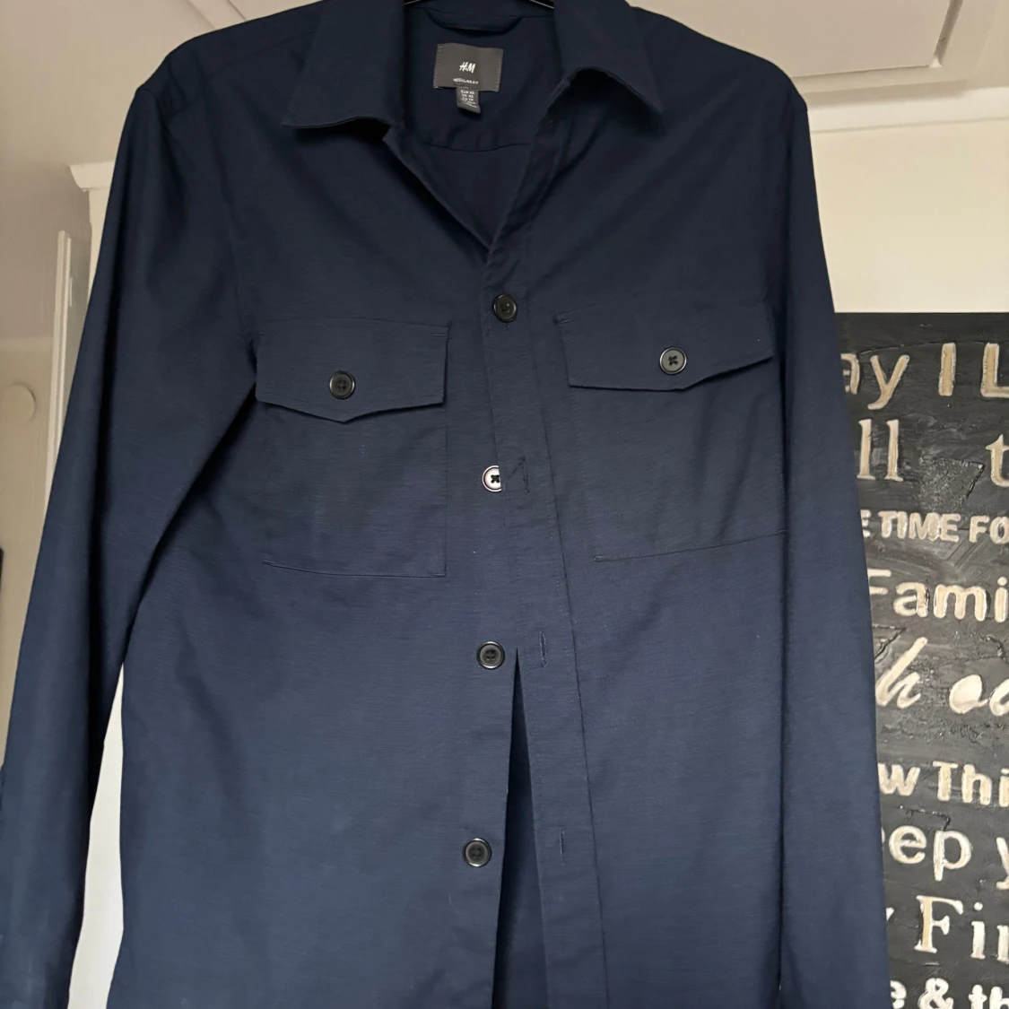 Stilren mörkblå overshirt från H&M med klassisk krage, två bröstfickor med lock och knappar framtill. Skjortan har lång ärm och rak passform, perfekt att bära öppen eller stängd. Materialet känns mjukt och lätt, vilket gör den enkel att styla.