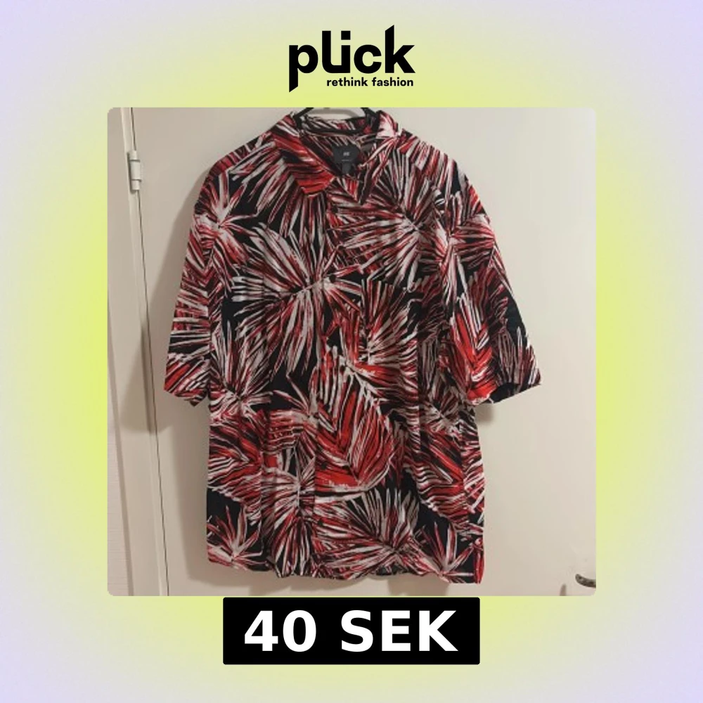 Säljer en färgstark skjorta från H&M med rött, vitt och svart palmbladsmönster. Skjortan har korta ärmar och avslappnad passform, perfekt för dig som gillar att sticka ut. Knappar framtill och klassisk krage.