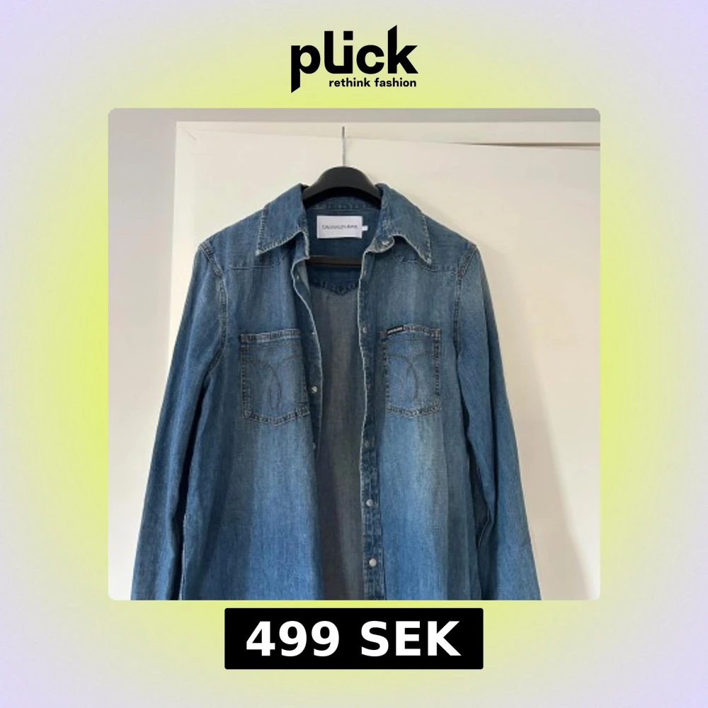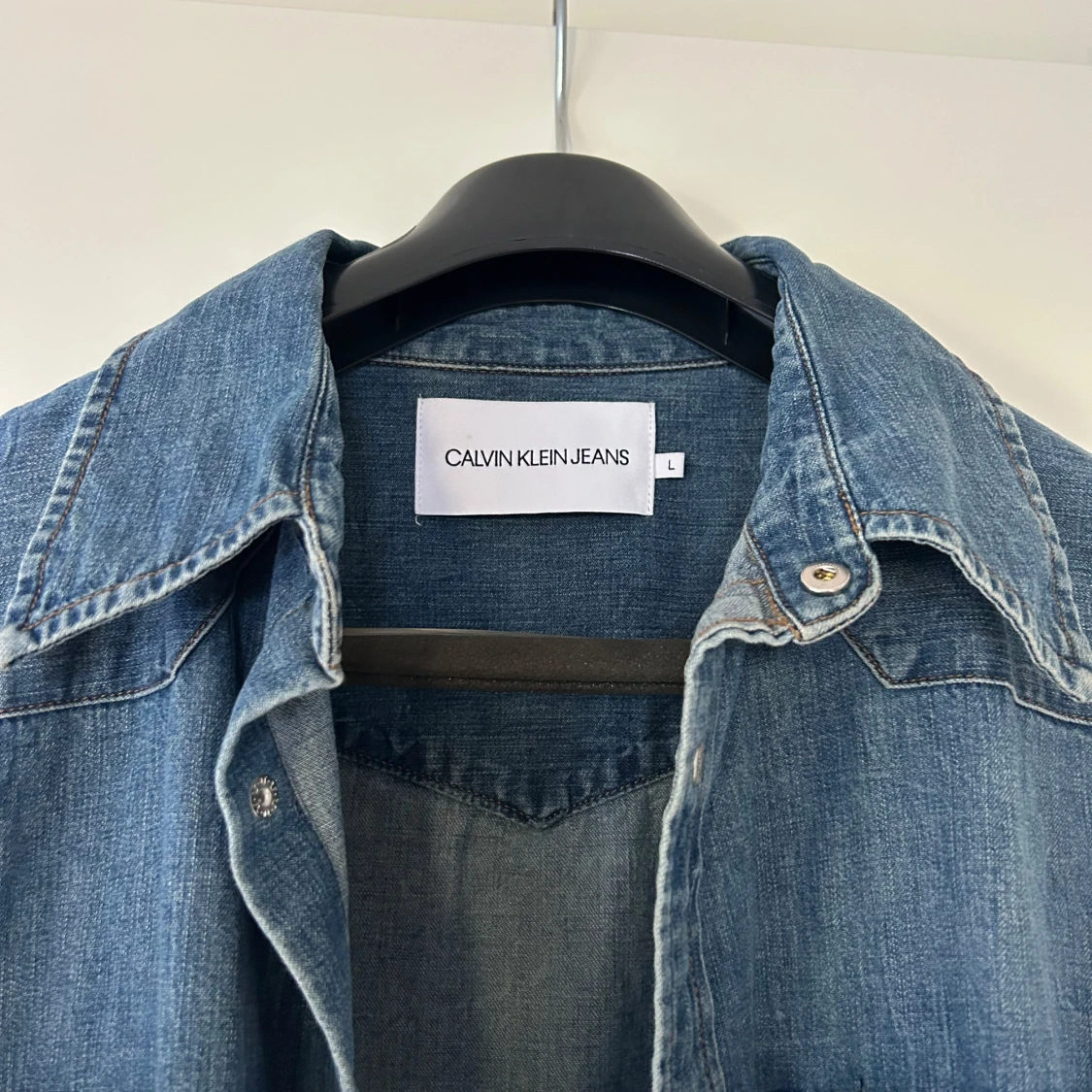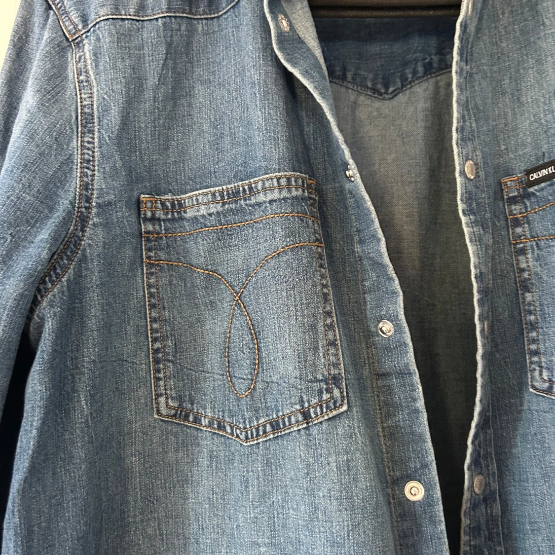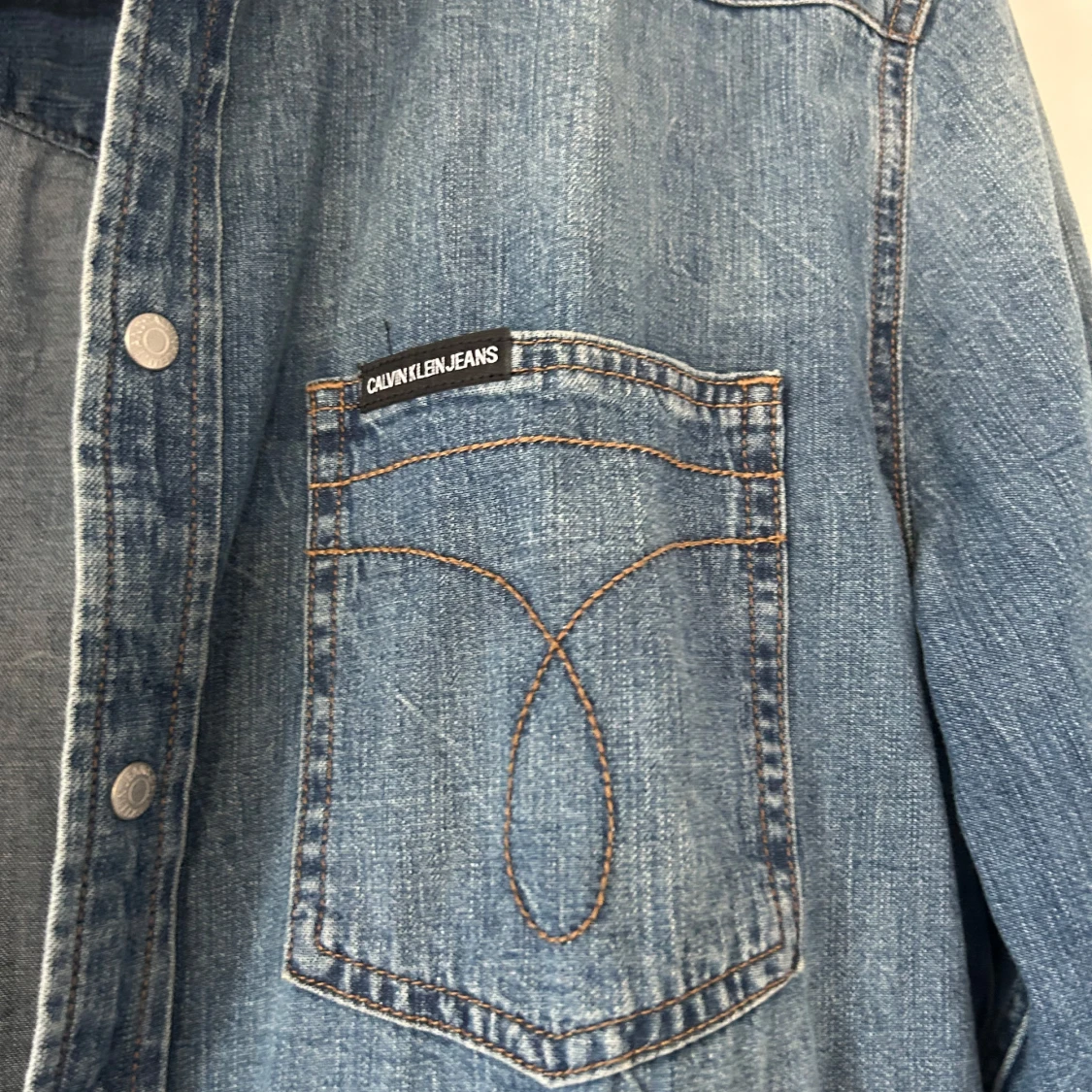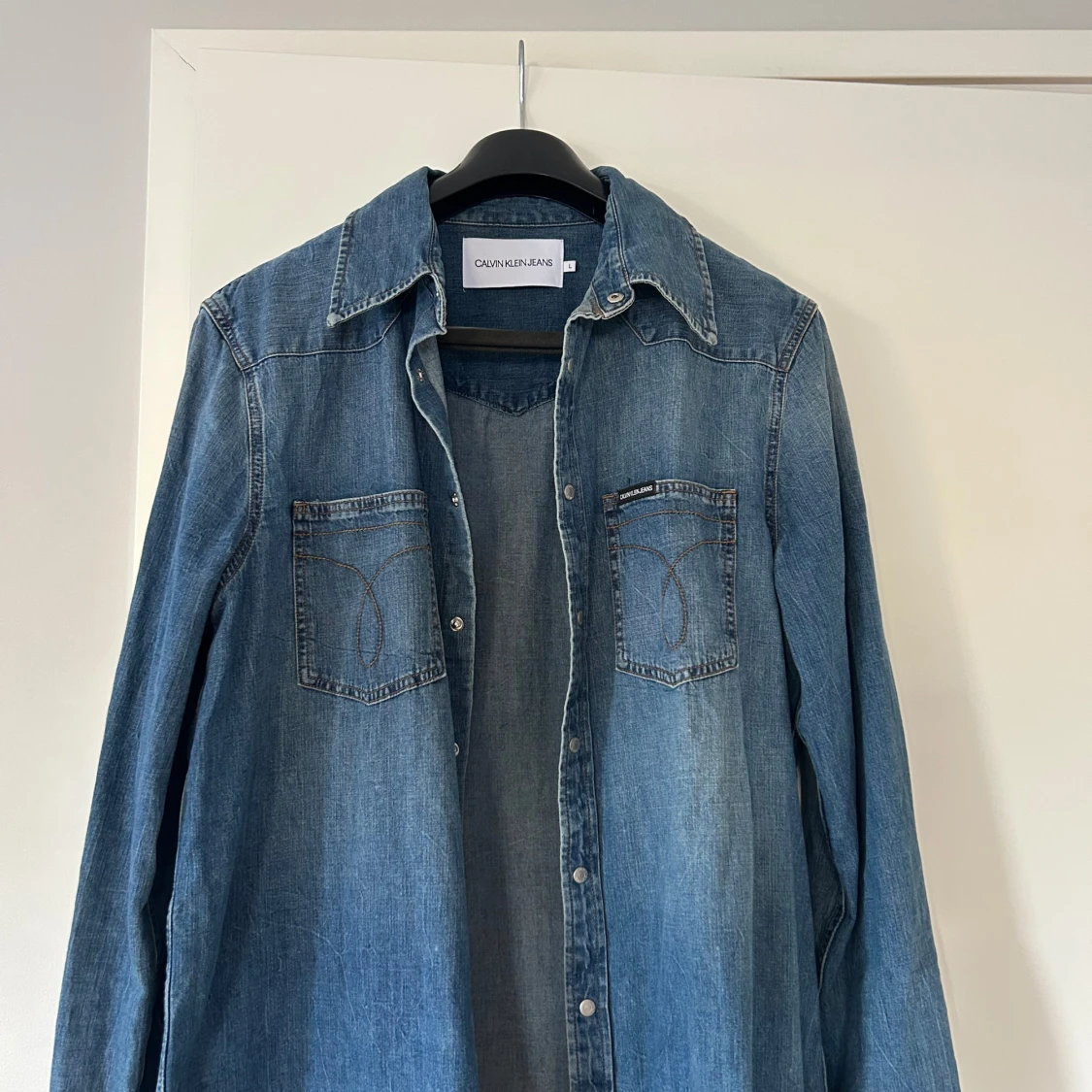 Säljer en klassisk blå jeansskjorta från Calvin Klein Jeans med två bröstfickor och snygga kontrastsömmar. Skjortan har tryckknappar framtill och en avslappnad passform. Storlek L, använd 1 gång.