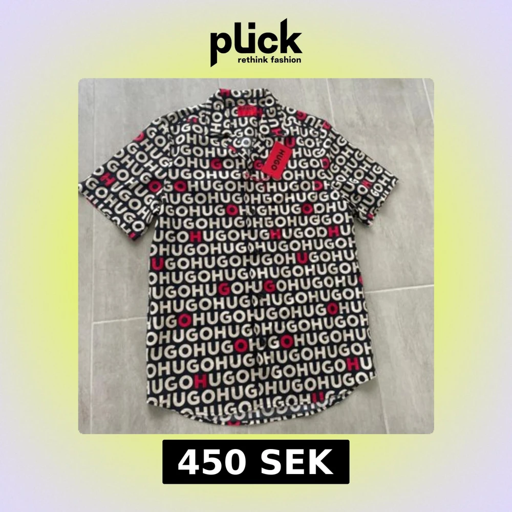 Snygg skjorta från Hugo med svart bas och stort logomönster i vitt och rött över hela plagget. Skjortan har klassisk krage, knäppning framtill och korta ärmar. Perfekt för dig som vill sticka ut med en trendig look. Prislapp siter kvar